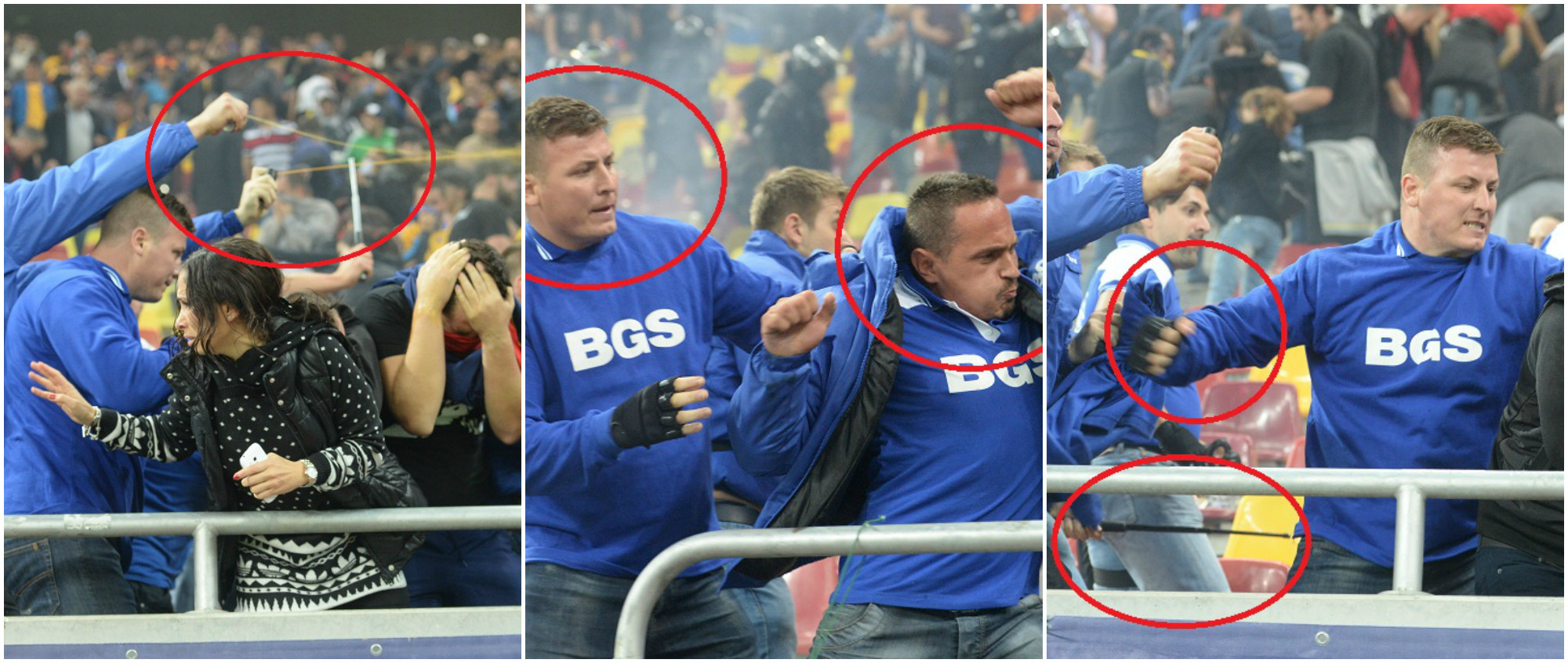 Angajatii firmei de paza au intervenit, iar in ajutorul lor au sarit si jandarmii. In momentul in care suporterii agresivi au inceput sa fuga, jandarmii s-au retras in dispozitiv. Angajatii firmei de paza., cu care are contract Federatia Romana de Fotbal ca sa pastreze ordinea pe stadion, si-au continuat insa atacul. Nu numai ca au folosit sprayuri lacrimogene si bastoane, dar au lovit si cu pumnii.