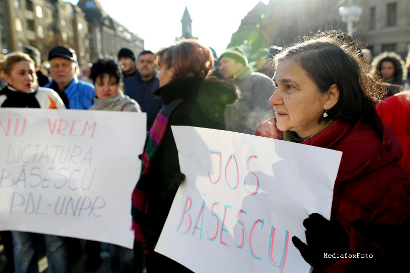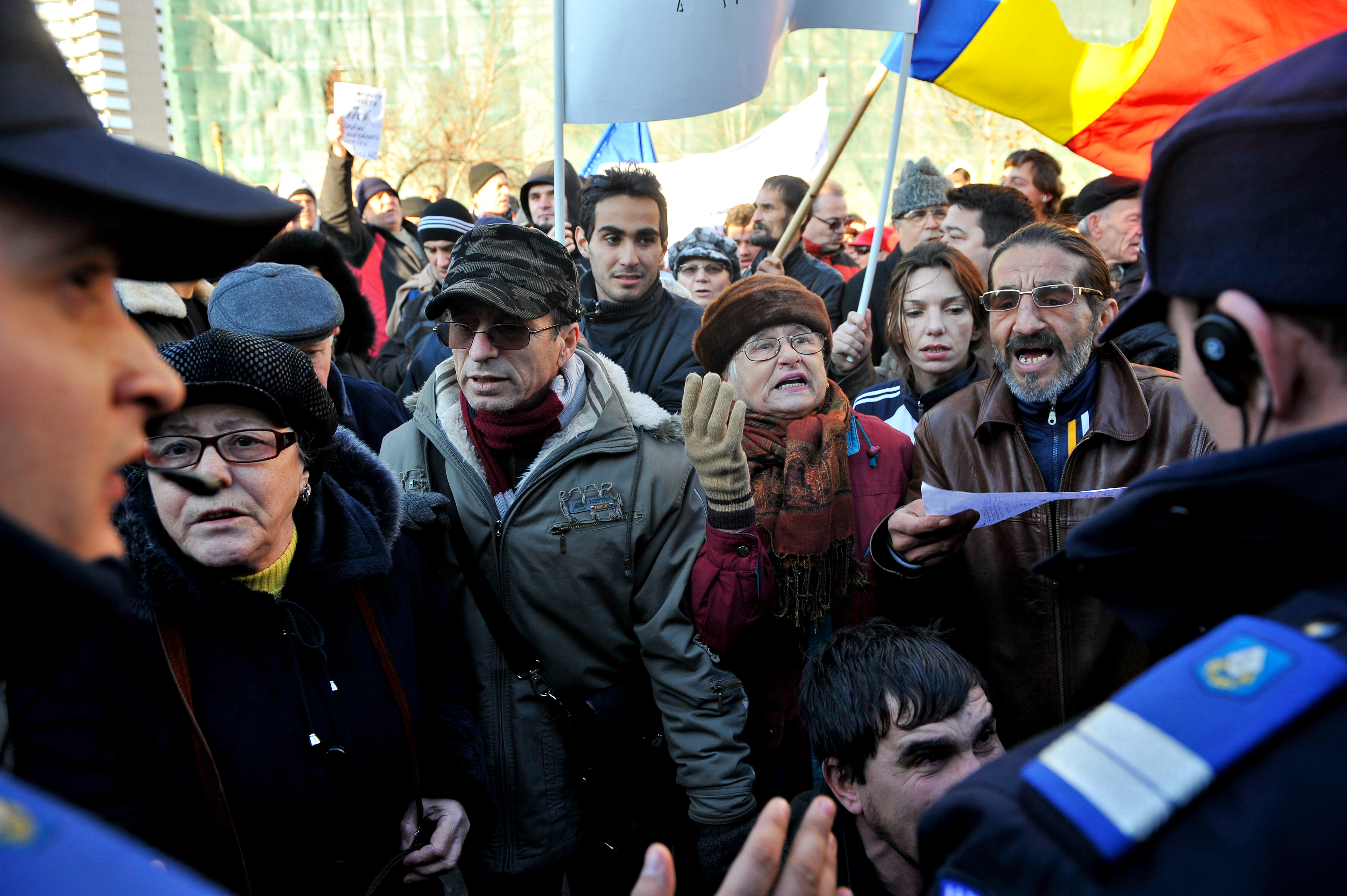 Aproximativ 1.500 de persoane protesteaza in Piata "Vasile Milea" din Pitesti, in fata Prefecturii Arges si a sediului organizatiei judetene a PDL.