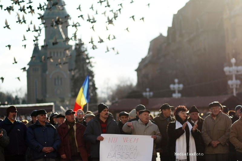 La Timisoara, peste 800 de persoane, printre care si suporteri ai echipei Poli Timisoara, au participat la un mars prin centrul orasului, scandand "Demisia", "Pacat, pacat, de sangele varsat" si purtand pancarte pe care scrie "Jos Basescu".