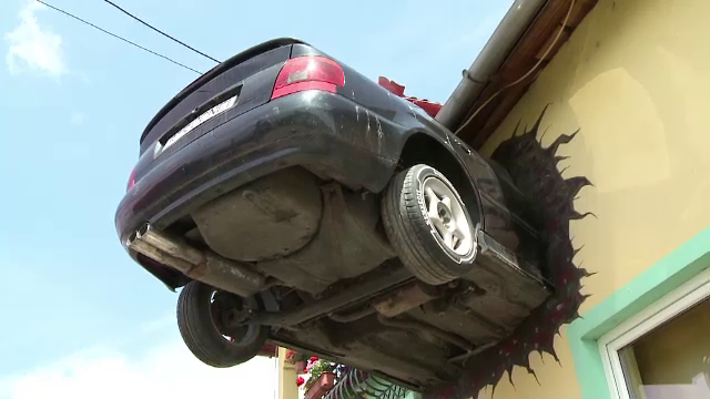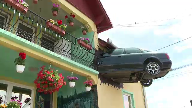 Pe fatada locuintei sale, tocmai la etaj, sta cocotat un autoturism ce pare ca s-a infipt acolo.