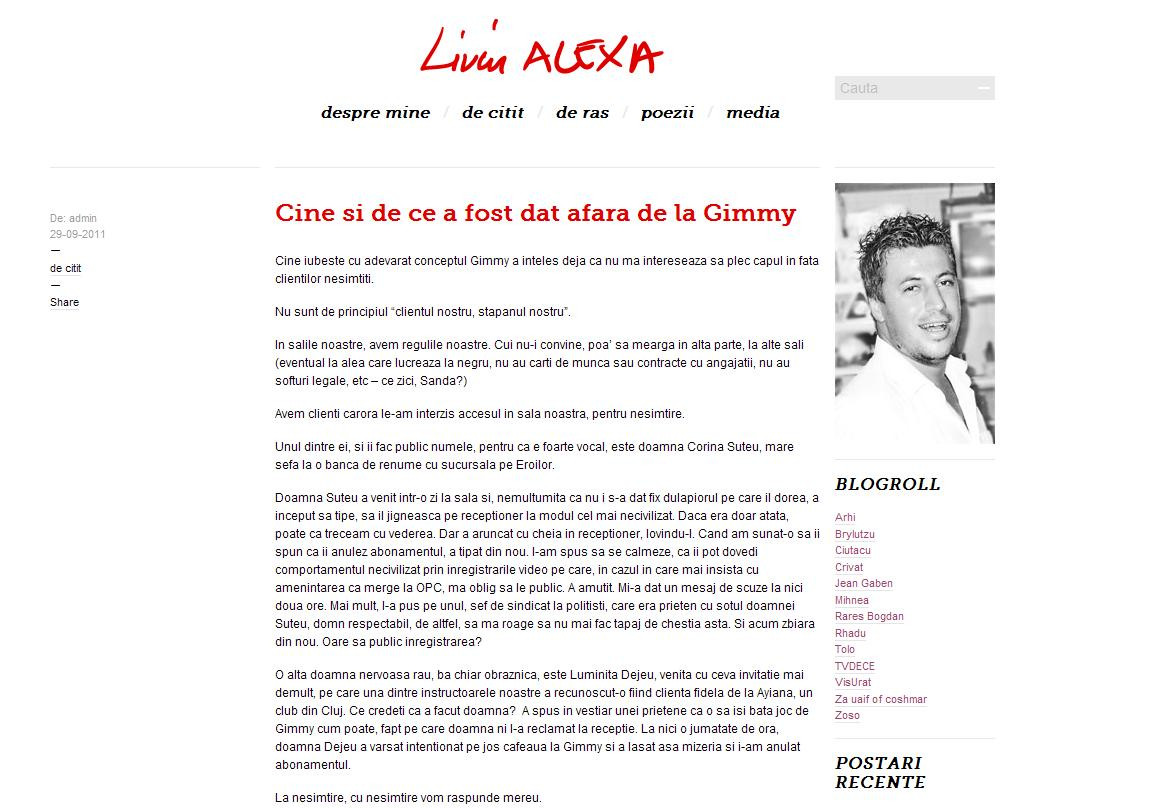 Avand in vederea faptul ca aceasta cauza incepe sa capete dimensiuni de natura penala, precum si faptului ca prin comportamentul sau abuziv domnul Liviu Alexa mi-a lezat in mod direct imaginea, demnitatea si reputatia, voi efectua toate demersurile legale in scopul tragerii acestuia la raspundere.