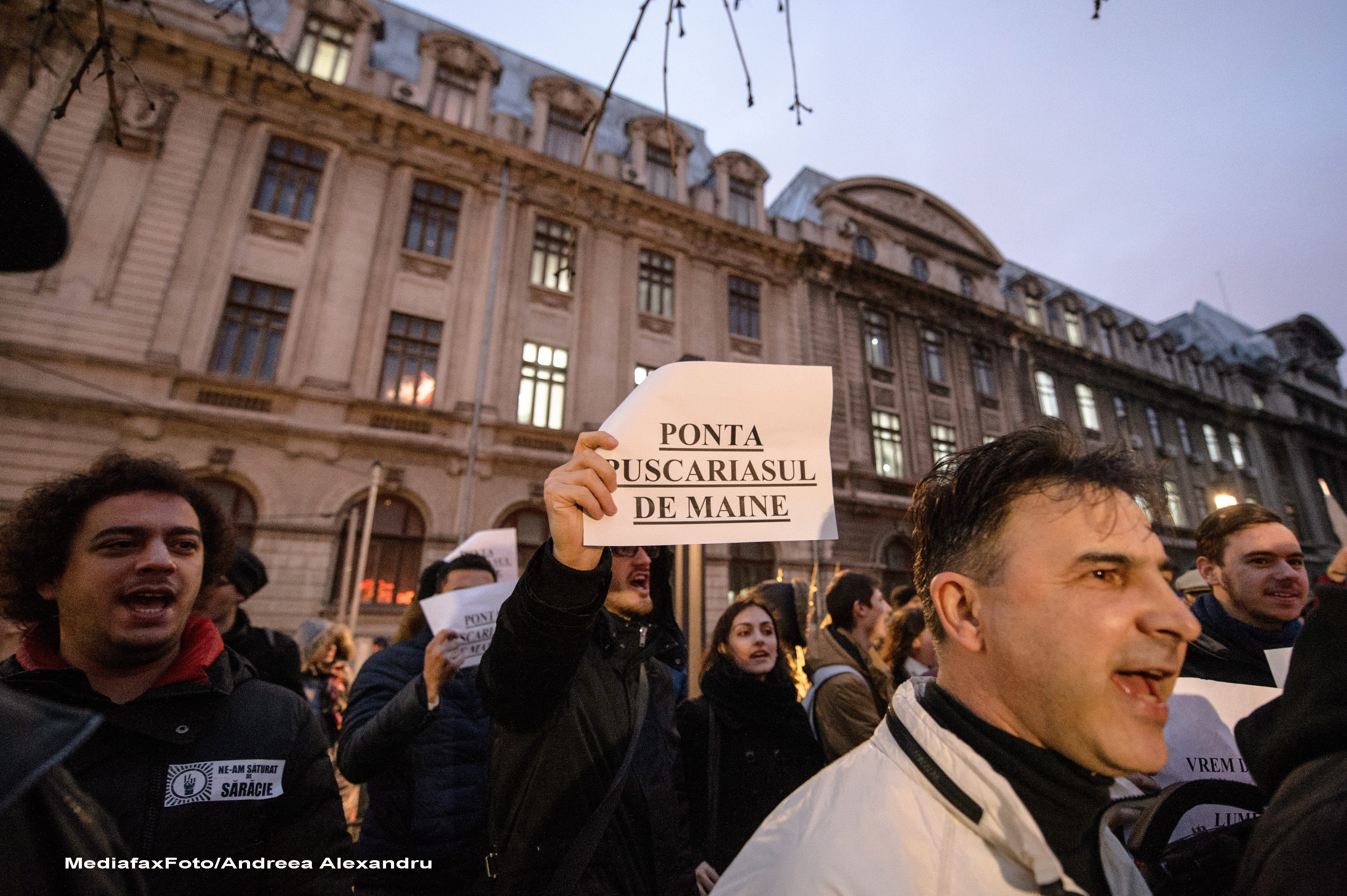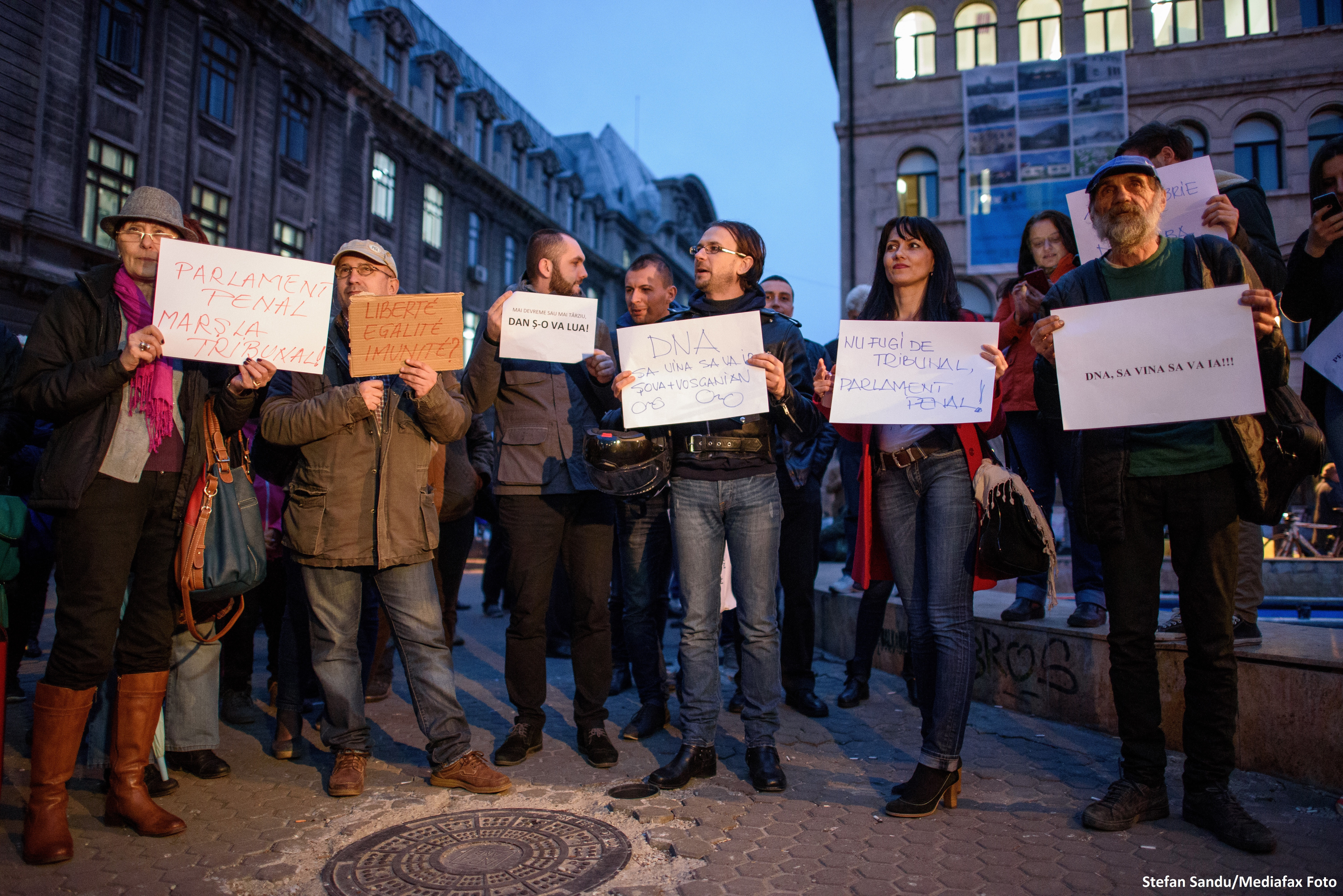 Si miercuri seara, aproximativ 100 de persoane au protestat la Universitate fata de avizul negativ dat, in aceeasi zi, de senatori in cazul cererii procurorilor DNA de retinere si arestare a lui Dan Sova, precum si in cazul cererii procurorilor DIICOT de incepere a urmaririi penale fata de Varujan Vosganian, pe 12 februarie.