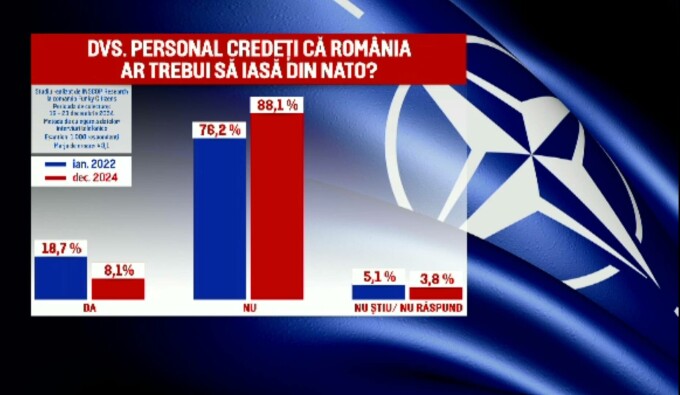 De asemenea, numărul celor care și-ar dori să părăsim Alianța nord-Atlantică a scăzut de la 18 % în 2022 la 8 % în decembrie 2024.