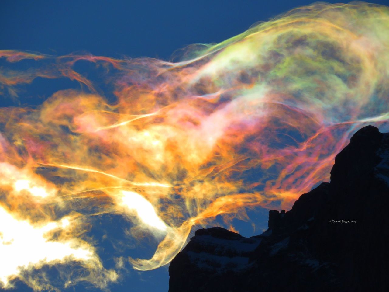 ”Ieri 24 februarie 2019 la apus, Bucegii au oferit un spectacol incredibil: cristalele microscopice de gheață din norii iridescenți au descompus lumina, oferindu-ne un adevărat curcubeu de iarnă!