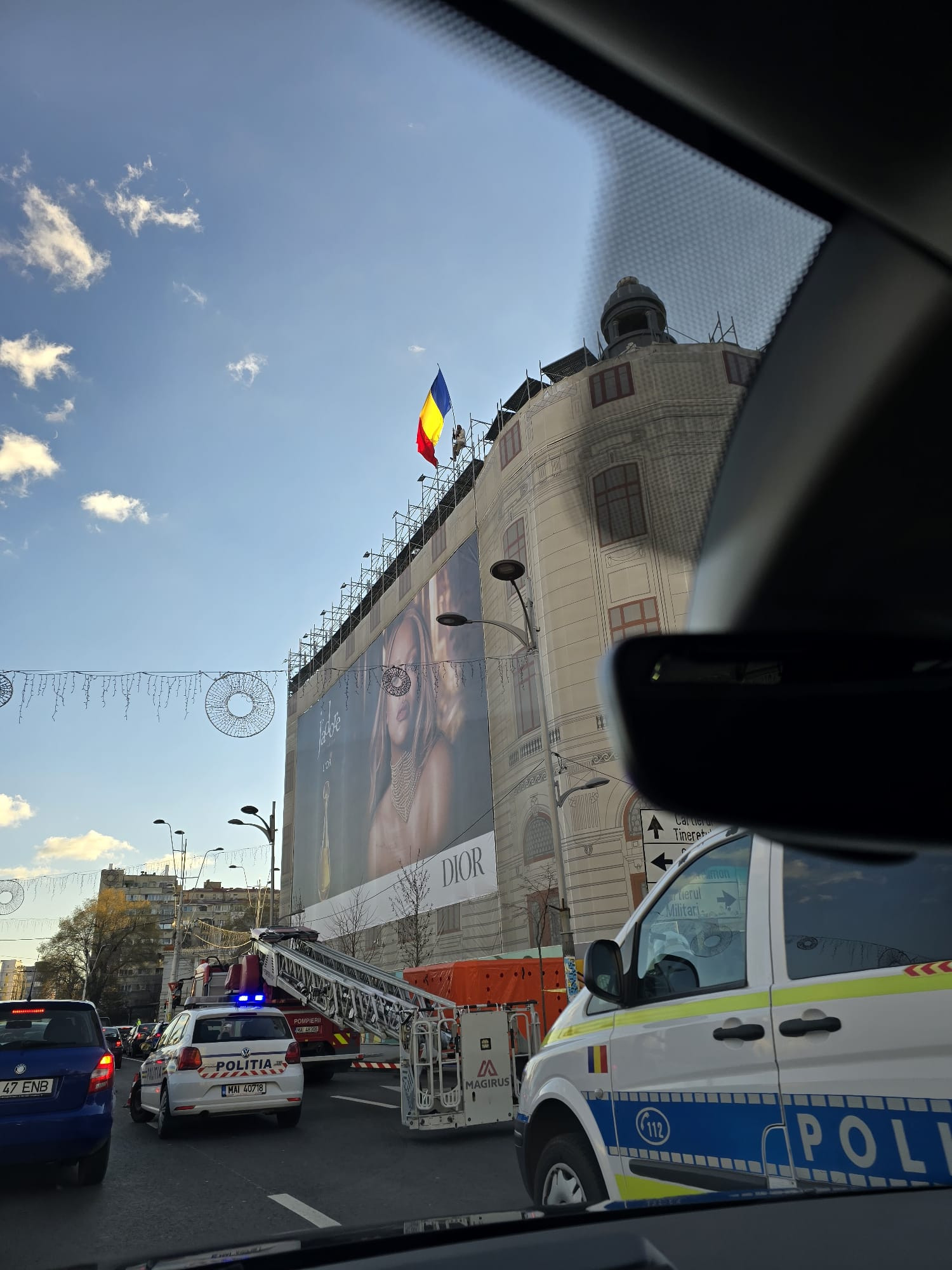 De asemenea, poliţiştii au delimitat şi au asigurat zona, în dreptul clădirii şi au fost aplicate restricţii de trafic rutier, pe benzile I şi II, sensul de mers dinspre Piaţa Romană către Piaţa Universităţii.