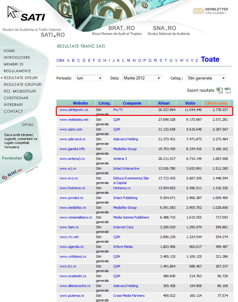 STIRILEPROTV.RO ramane site-ul nr. 1 de continut din Romania in clasamentul SATI pe luna martie