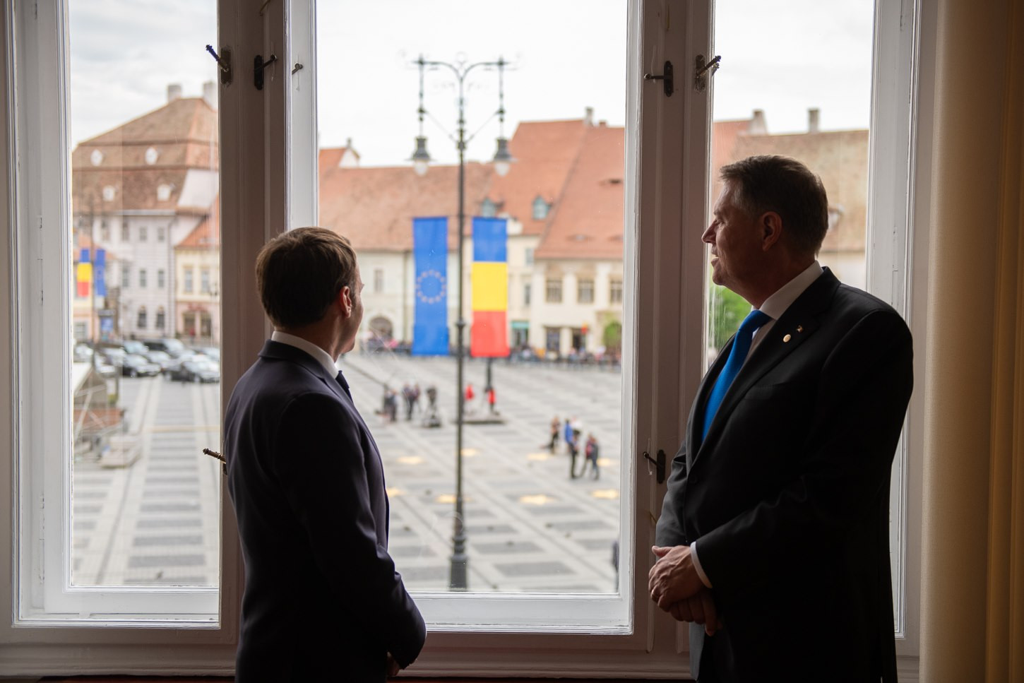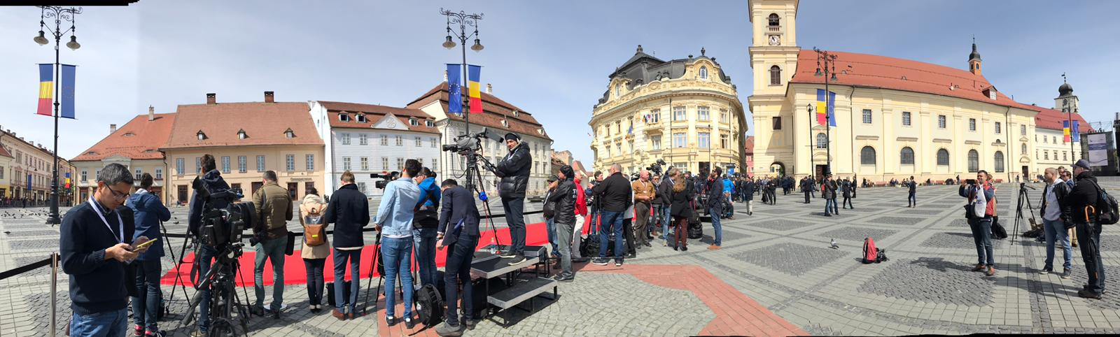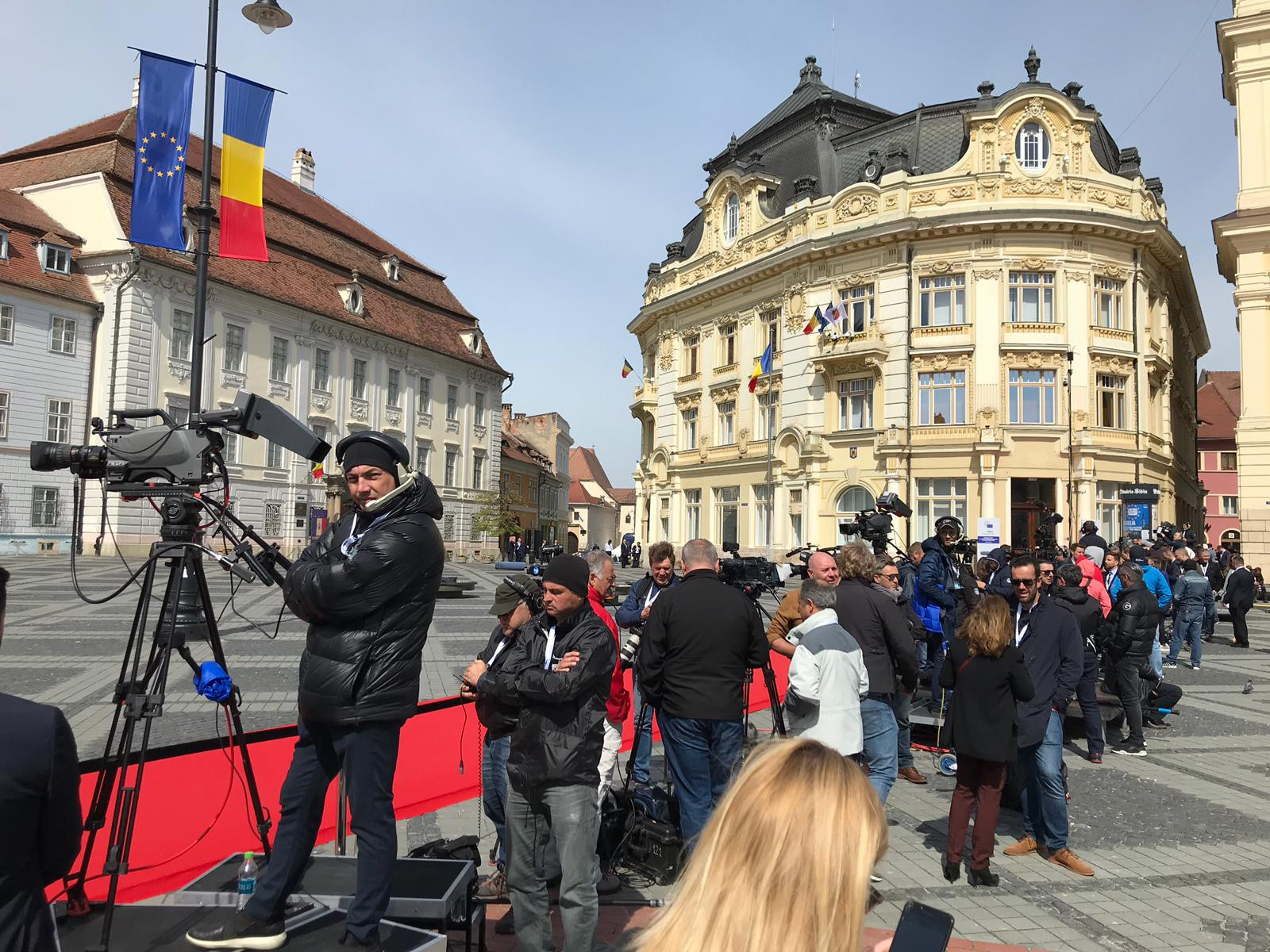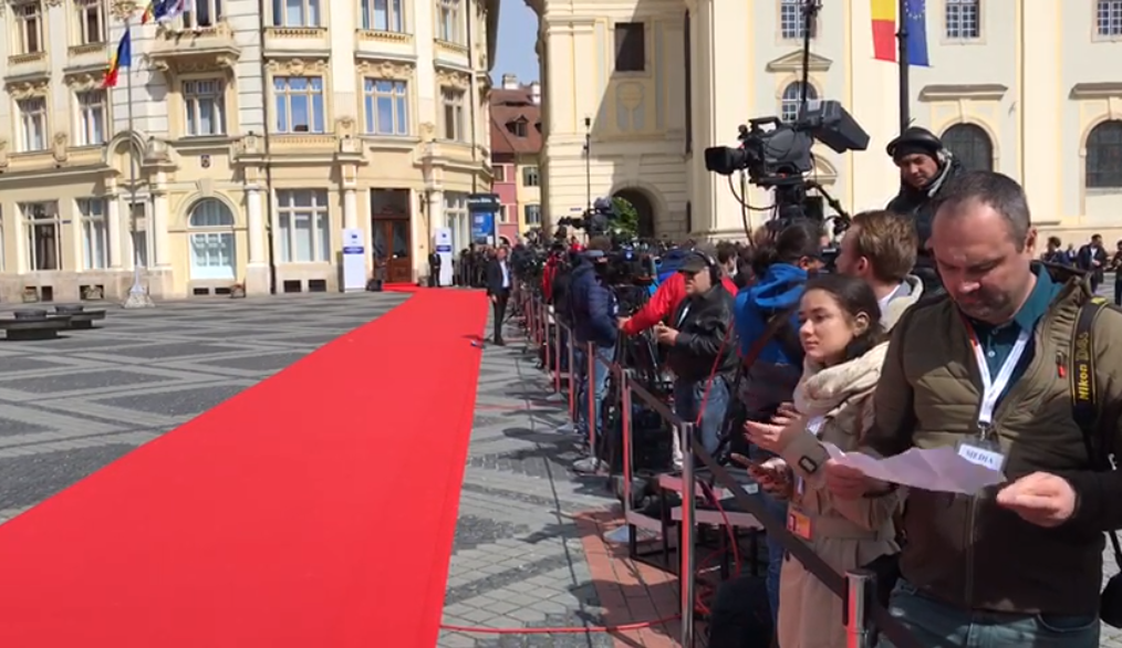 ora 09.15: Mihai Peticilă, corespondent Știrile ProTV: „Mai sunt câteva ore. În jurul orei 10.45 vor sosi aici delegațiile – cele mai importante din Europa. Pe un covor roșu de 50 de kilometri vor păsi cei mai importanți oameni din Europa: Angela Merkel și Emmanuel Macron, dar și alți șefi de state și de guverne. Aici, acest loc, probabil că este în acest moment cel mai sigur loc din Europa, pentru că măsurile de siguranță luate de către autorități au fost unele de grad zero. Piața a fost golită încă de aseară. Nu se mai vede nimic pe jos. În Piața Mare sunt așteptate delegațiile. Televiziunile și presa vor avea acces doar la momentul sosirii delegațiilor: vor fi 900 de jurnaliști de-a lungul acelui covor roșu. Cei mai importanți oameni ai summitului: Donald Tusk, Jean Claude Juncker, Klaus Iohannis sunt deja în oraș. Aseară, Frans Timmermans a fost văzut într-o cafenea din Sibiu. Între orele 12.00 și 18.00 vor discuta despre viitorul Europei.”