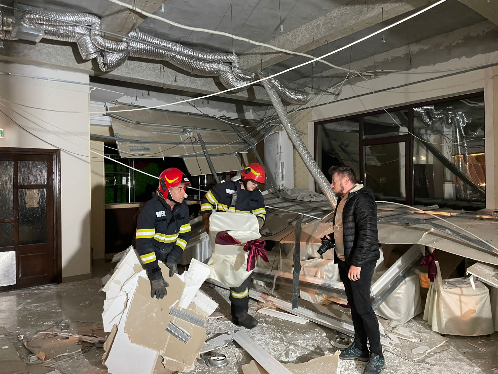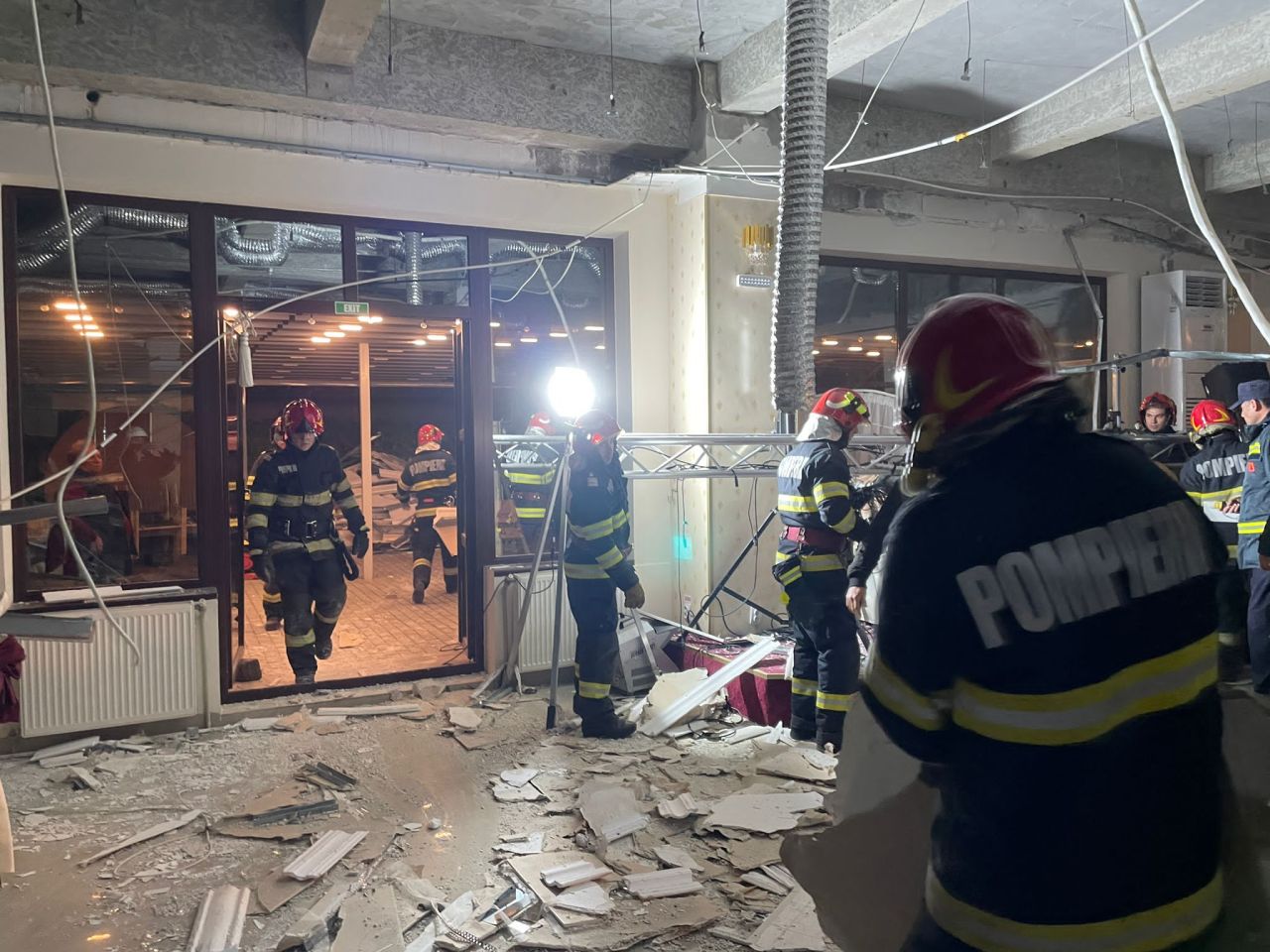 În scurt timp, au ajuns și salvatorii, care au constatat că plafonul a căzut pe o suprafața de 250 de metri pătrați.