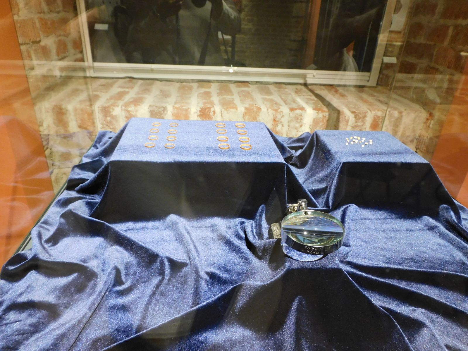 O parte dintre inelele din aur şi mărgele de sidef descoperite au fost expuse într-o vitrină, cu ocazia conferinţei de presă.