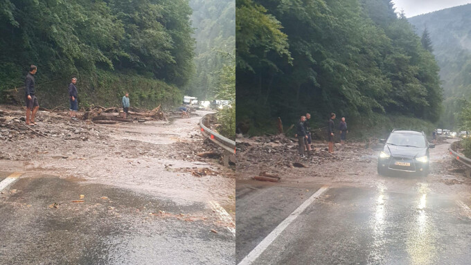 Viitura a adus de pe munte cantități mari de pietre și crengi, care au blocat șoseaua. În multe zone, apa curgea ca într-un râu.