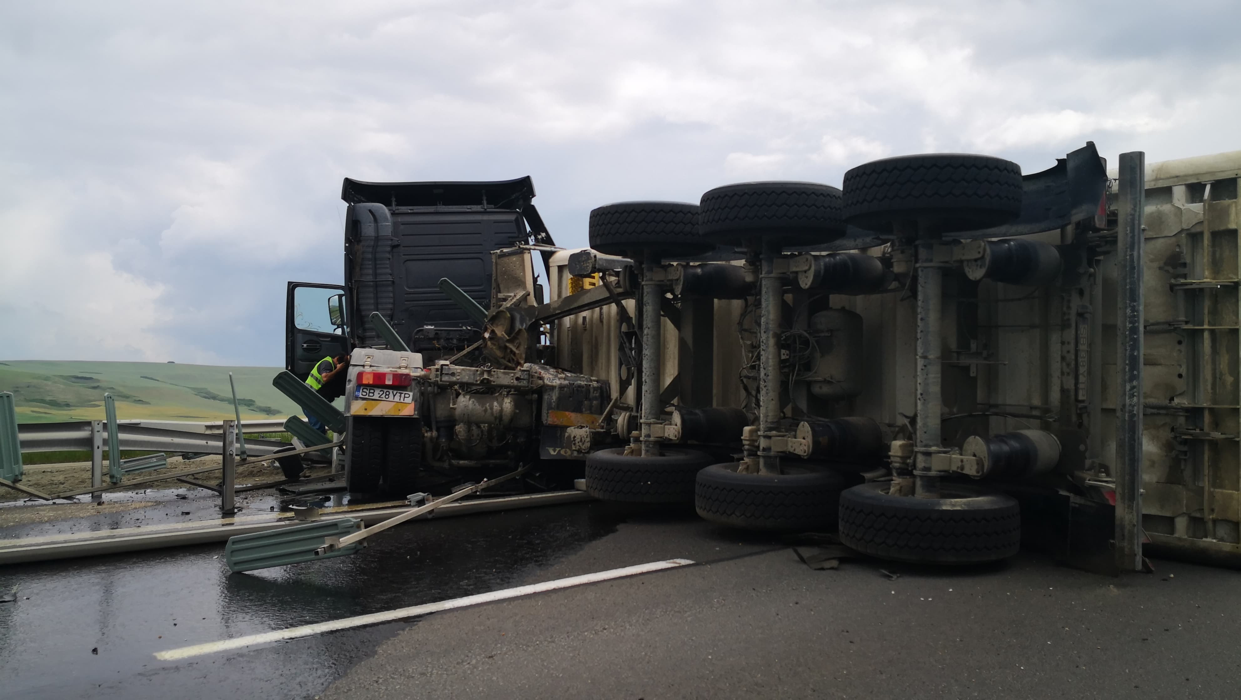 TIR răsturnat pe autostrada Sebeș - Sibiu. Vehiculul a ajuns de-a curmezișul șoselei