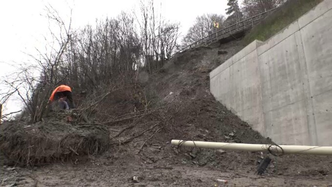 O bucată de pământ de sub șosea a luat-o la vale, dar potrivit celor de la Compania Națională de Drumuri, deocamdată nu există pericolul ca drumul național să se surpe.