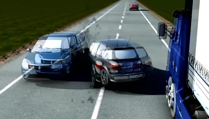 Acesta a facut o depasire periculoasa si a lovit doua masini, pe care le-a aruncat pe camp, apoi s-a ciocnit cu un TIR.