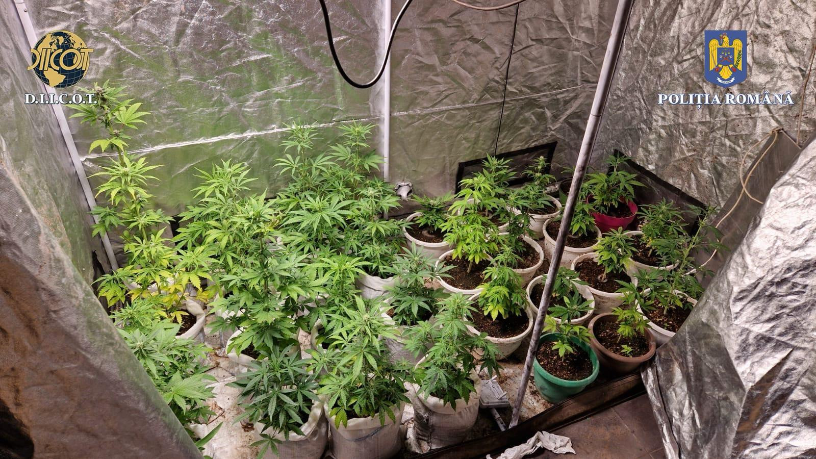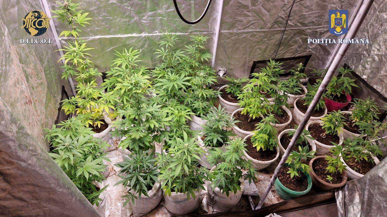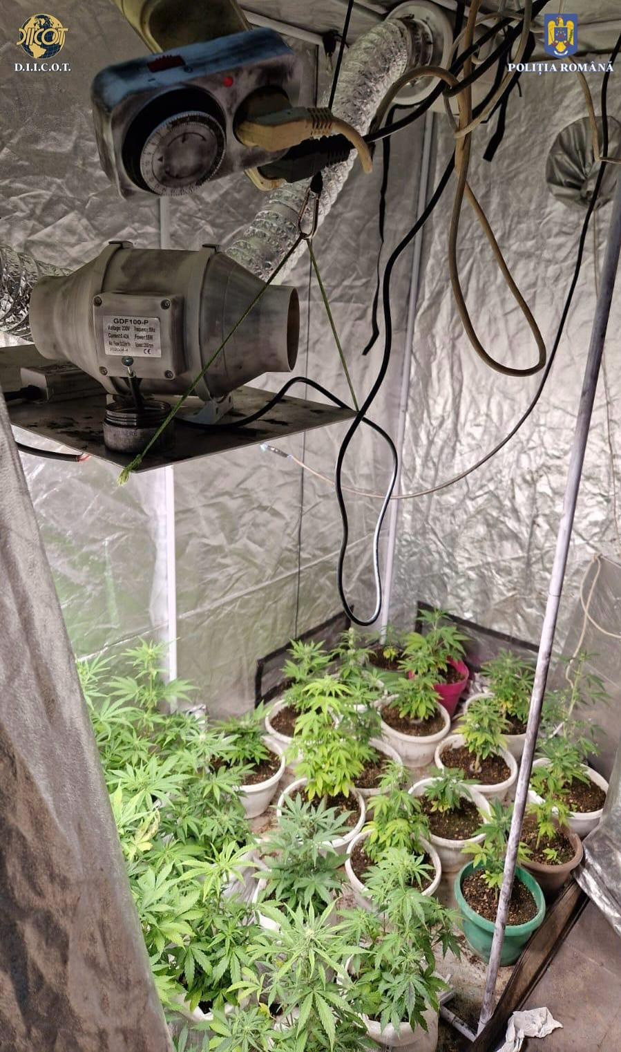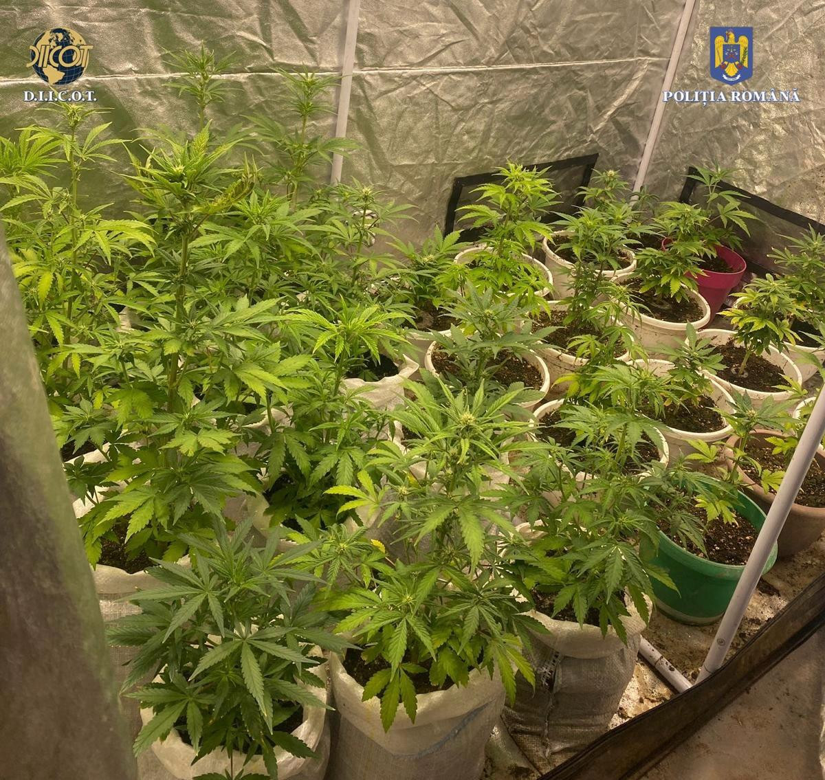 „În continuarea cercetărilor, au fost puse în aplicare două mandate de percheziţie domiciliară, la adresele celorlalţi doi inculpaţi, fiind identificate şi ridicate o cultură indoor de canabis, formată din 32 de plante destinate comercializării, instalaţii aferente dezvoltării şi întreţinerii culturii, un cort de protecţie, o armă neletală supusă autorizării şi 5 cutii cu alice, o arbaletă şi 13 săgeţi", arată anchetatorii.