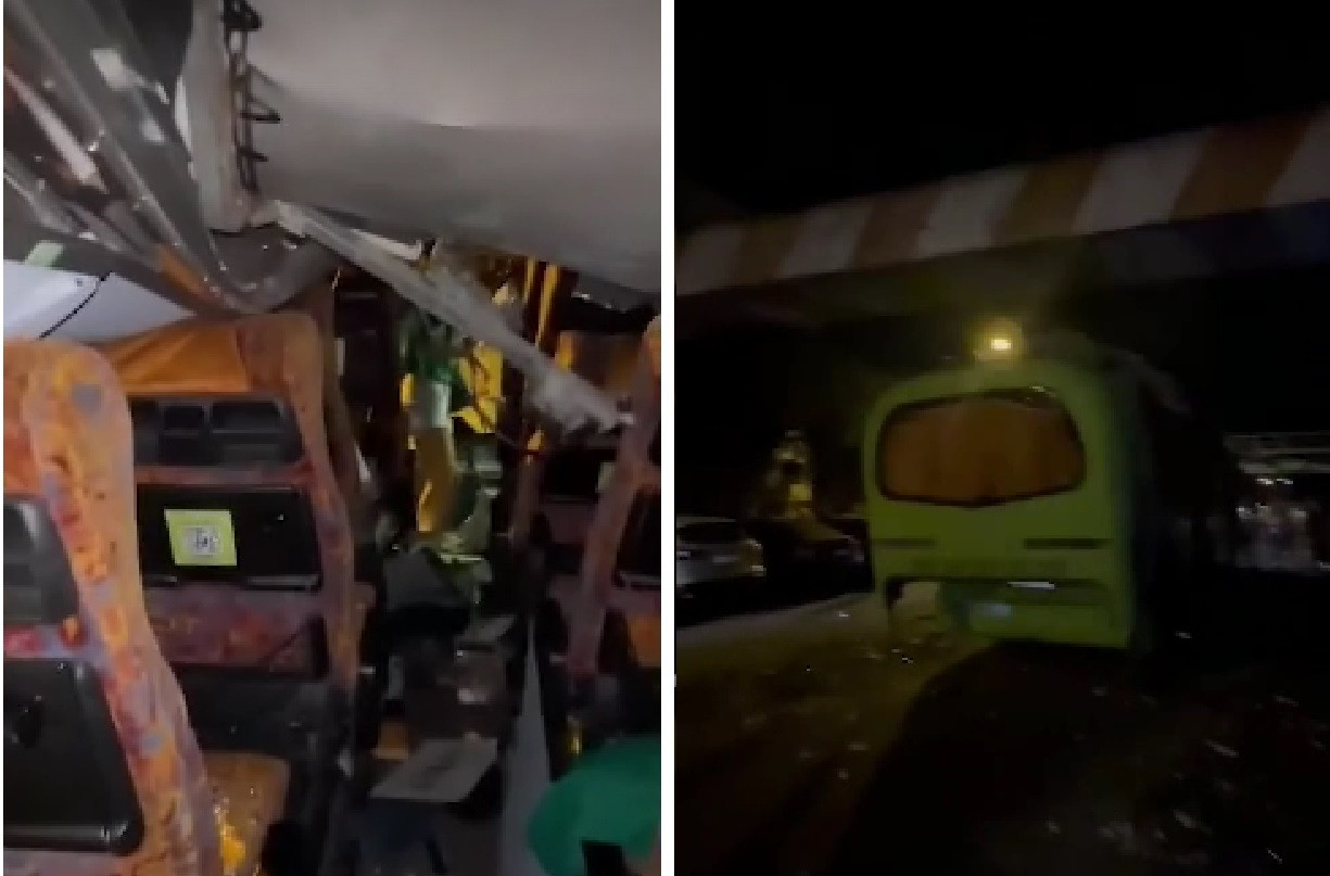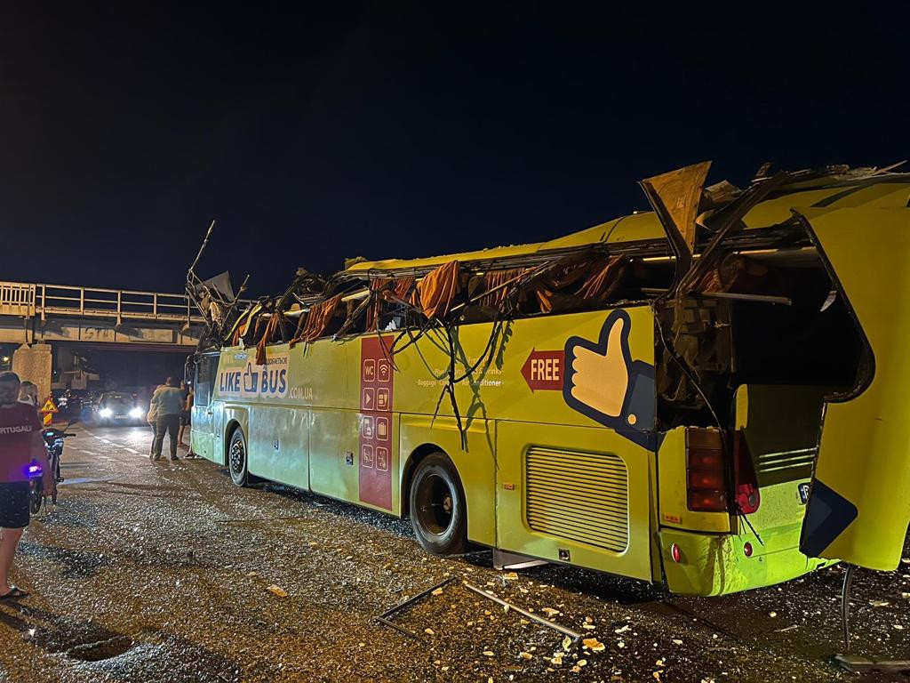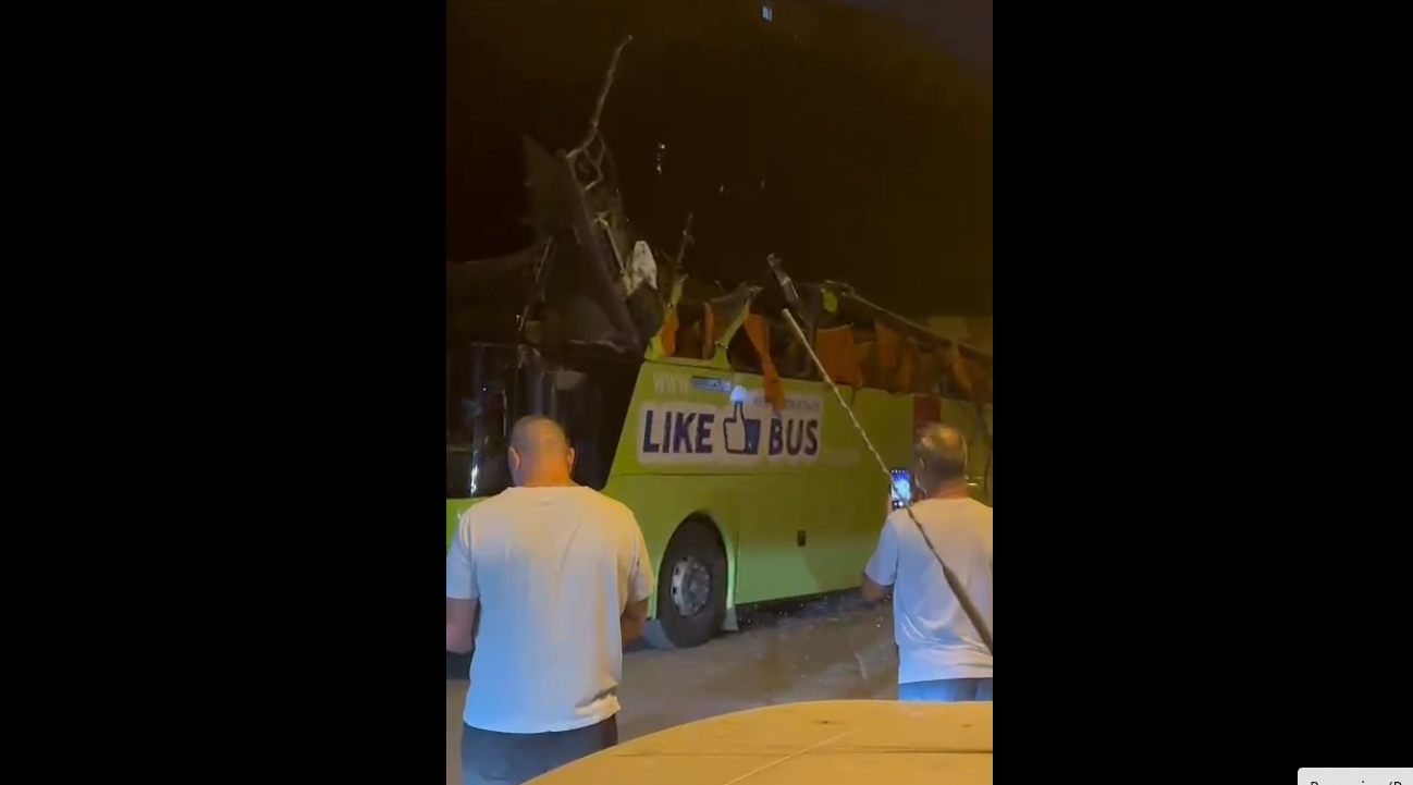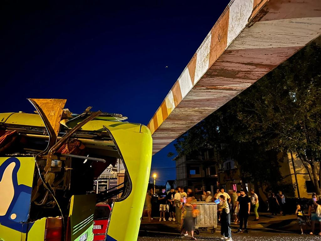 Autocarul cu etaj a suferit un impact cu un pod, prin nerespectarea regimului de înălțime.