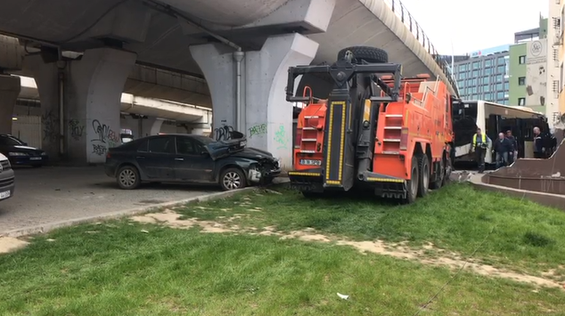 Un autobuz Mercedes al Societății de Transport București a fost implicat într-un accident, luni după-amiază, în zona Podului Basarab.