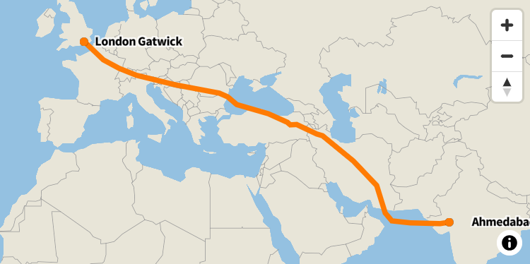 Directoratul General al Aviaţiei Civile (DGCA) a identificat aeronava ca fiind un Boeing 787 cu numărul de înmatriculare VT-ANB, care efectua zborul AI-171 cu destinaţia Londra-Gatwick. La bord se aflau 2 piloţi, 10 membri ai echipajului de cabină şi 230 de pasageri.