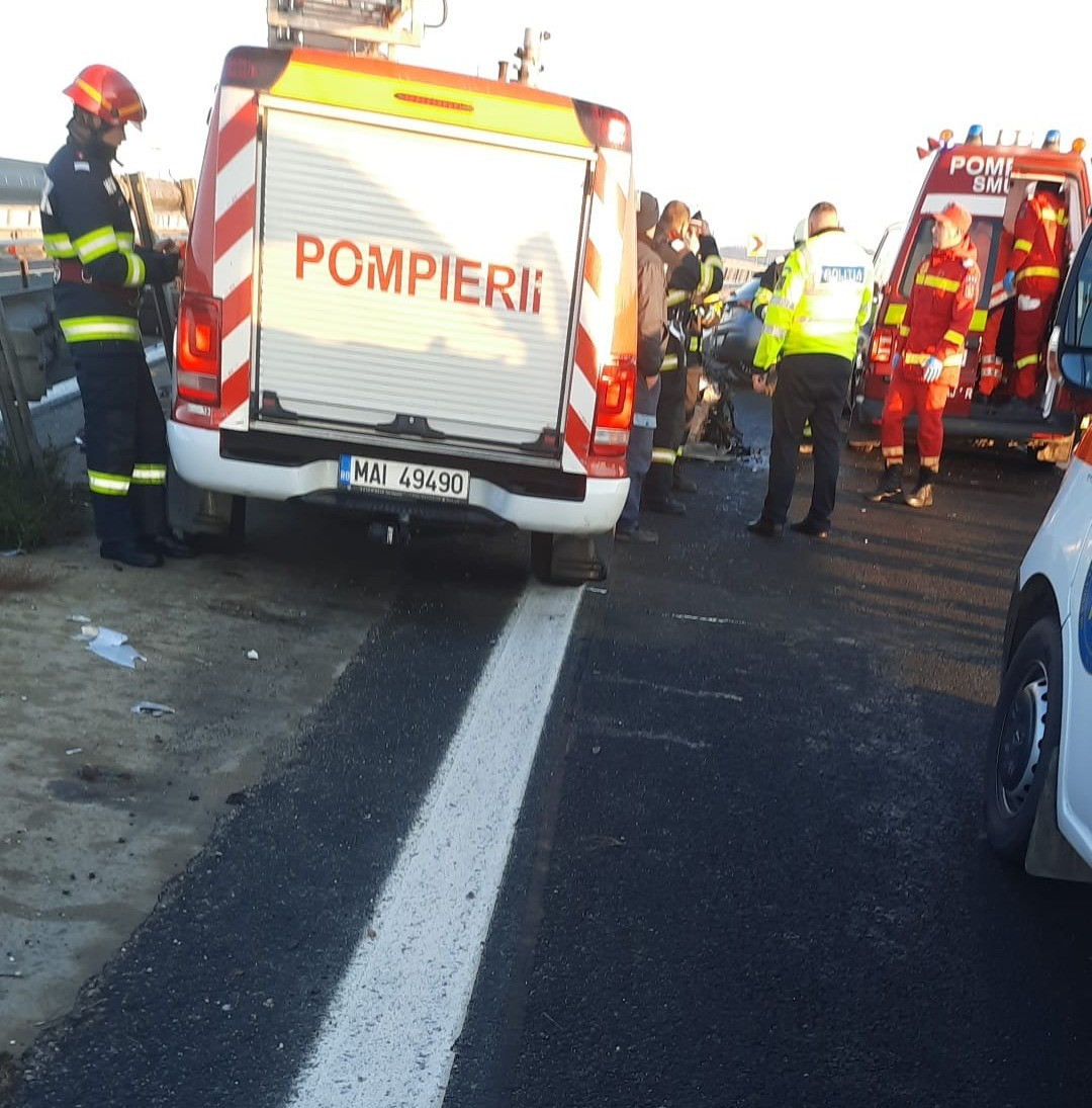 Un bărbat a intrat cu maşina într-un parapet, pe autostrada A6, nodul de urcare pe A1. A fost luat cu elicopterul SMURD