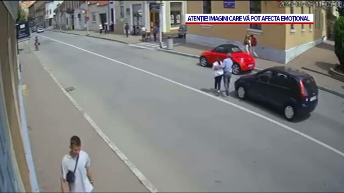 În imaginile surprinse de o cameră de supraveghere se observă cum bărbatul ține fata pe după umeri, așteaptă să treacă o mașină, apoi amândoi traversează în fugă.