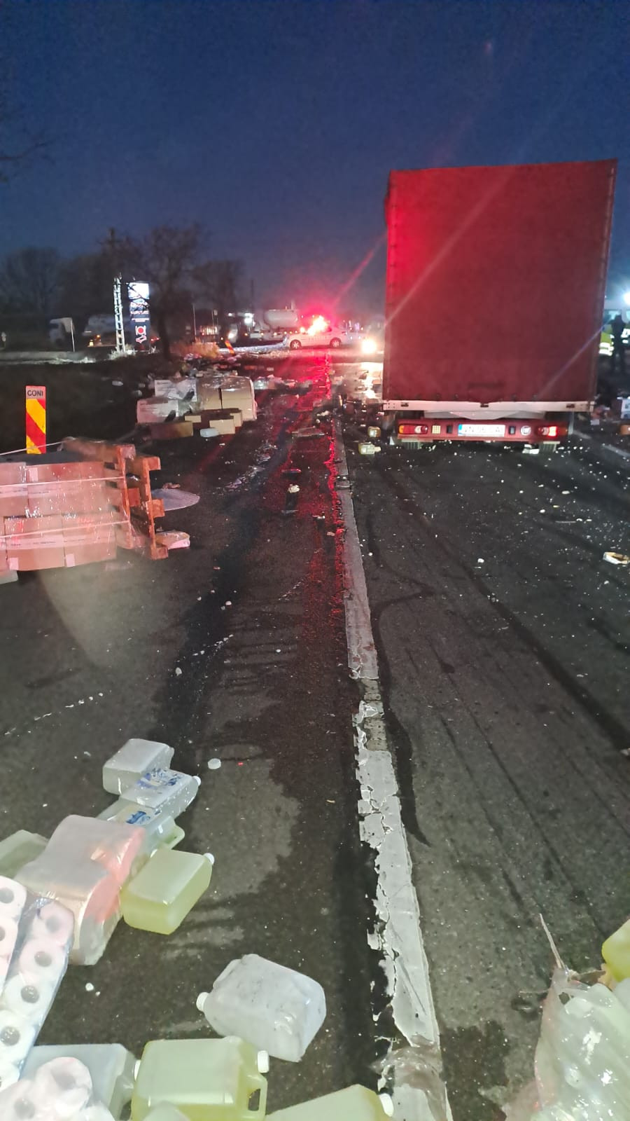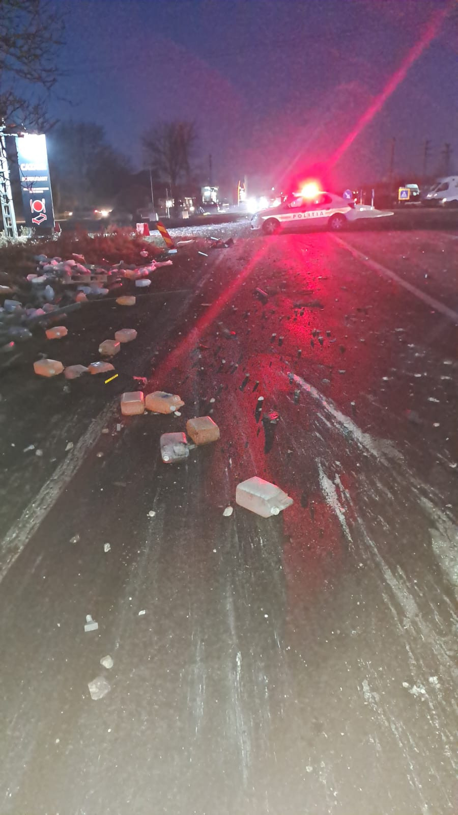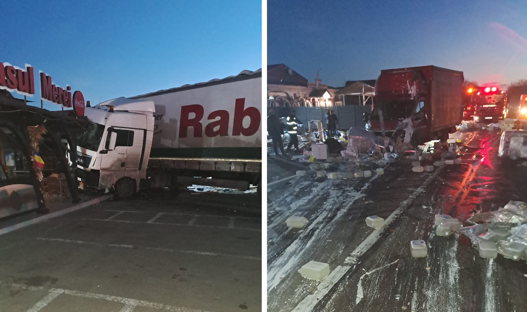 „Pe DN 1B, în zona localităţii Merei, judeţul Buzău, conducătorul unui autocamion a pierdut controlul direcţiei în rondul de la intersecţia cu DJ 203G, s-a răsturnat, a lovit un autoturism, iar apoi a intrat într-un restaurant”, anunţă Centrul INFOTRAFIC din Inspectoratul General al Poliţiei Române.