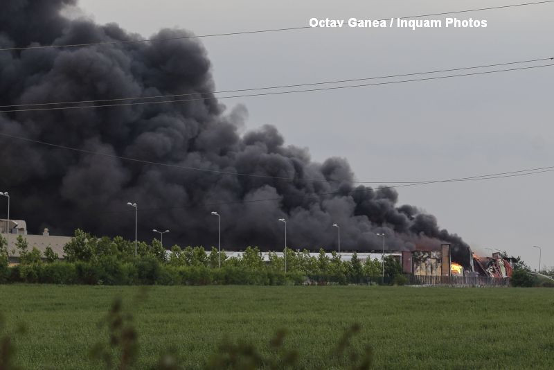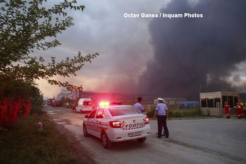 UPDATE 22:30 Un purtator de cuvant din partea pompierilor a declarat ca a fost adoptata o tactica defensiva, pentru a nu pune in pericol viata salvatorilor care au intervenit. In hale se aflau mai multe recipiente sub presiune, de aici fiind si exploziile. De asemenea, a dat asigurari ca in atmosfera nu au ajuns substante care sa puna in pericol sanatatea persoanelor din jur.