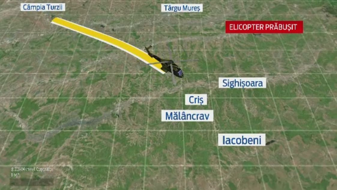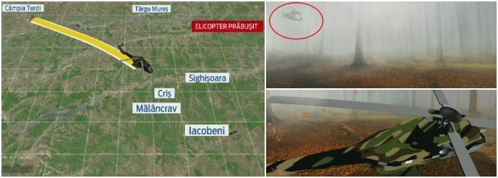ORA 11:50 - Elicopterul a plecat de la Campia Turzii catre Cincu, la un poligon militar. S-a prabusit intr-o zona impadurita, mlastinoasa, in care se ajunge greu.