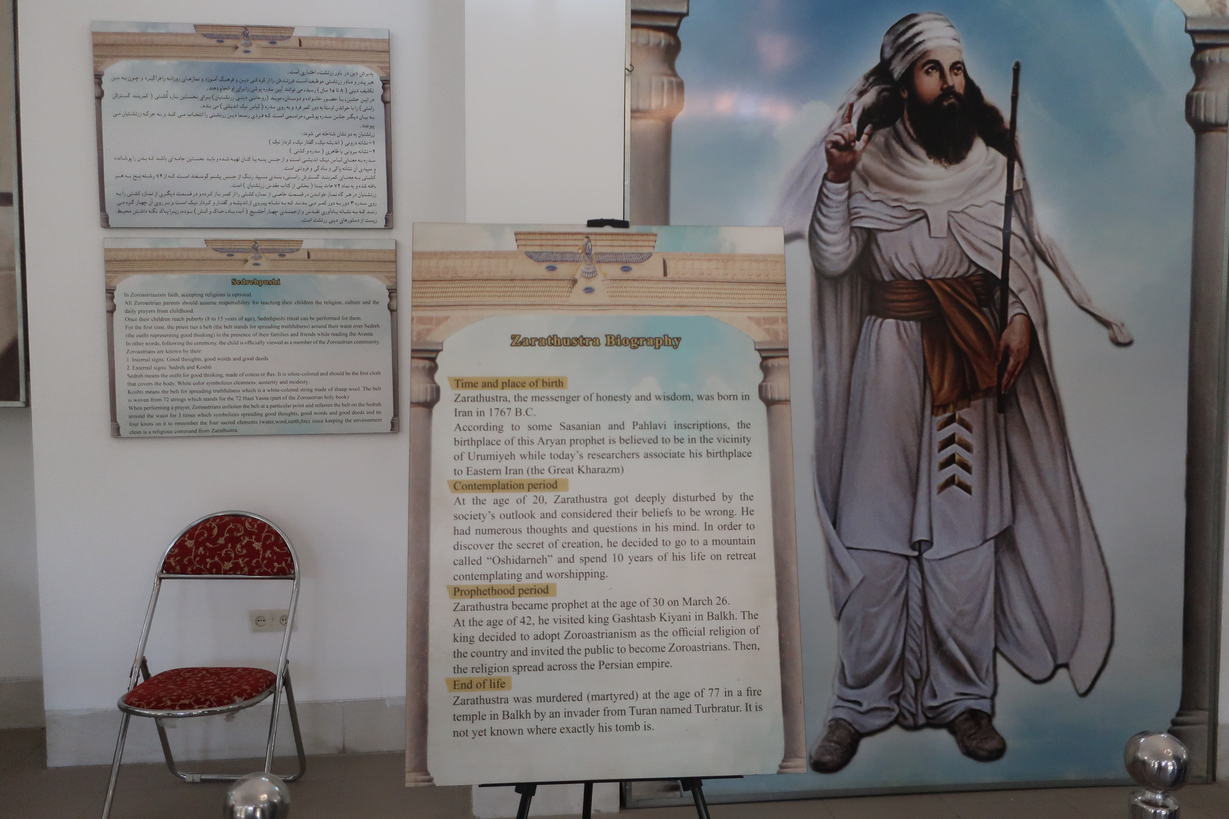 Să nu uităm de zoroastrianism, religia originară a persanilor de dinainte de cucerirea arabă. În Yazd se află cel mai cunoscut templu al lor, cu un foc ce arde continuu de peste 2.500 de ani. Muzeul din același loc oferă informații despre profetul Zoroastru și practicile religioase, toate acestea fiind tolerate de către regim.”