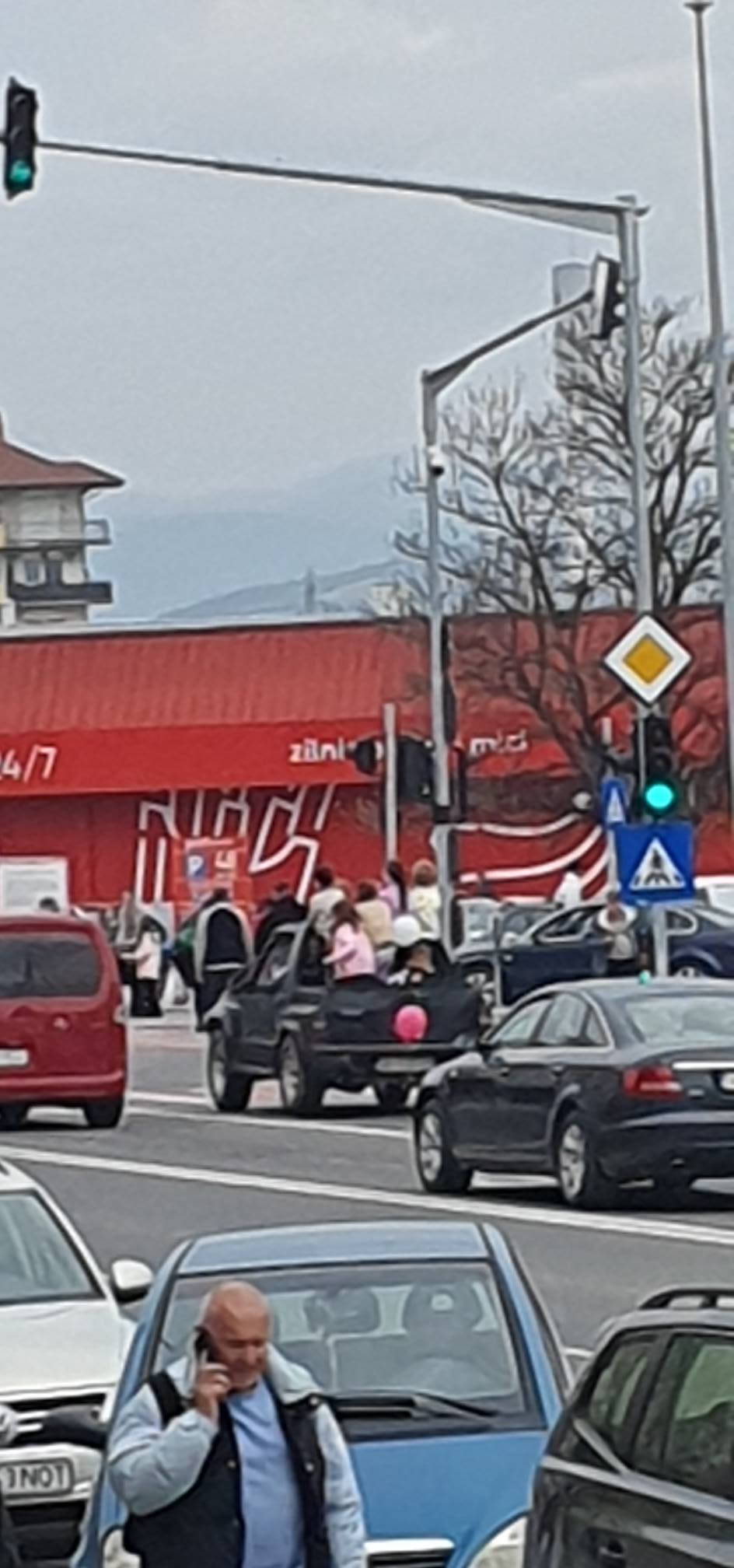 În fotografiile postate pe reţelele de socializare se vede un autovehicul cu benă deschisă, în care şapte copii stau înghesuiţi.
