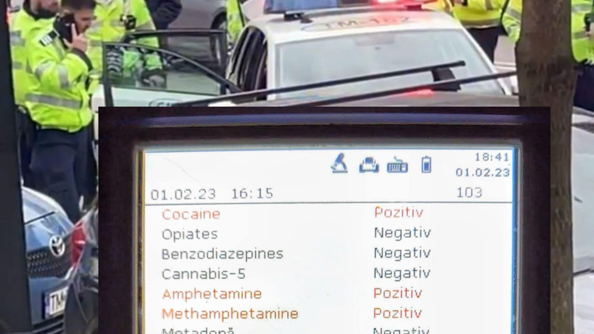 După ce l-au verificat în baza de date, polițiștii au constatat că șoferul nu avea permis de conducere, iar drugtestul a indicat prezența a trei substanțe: cocaină, amfetamină și metamfetamină.