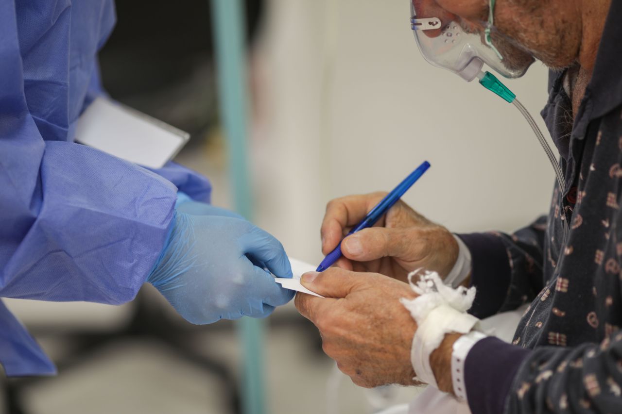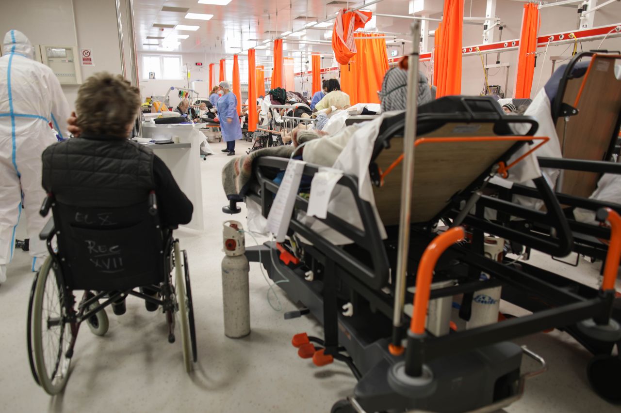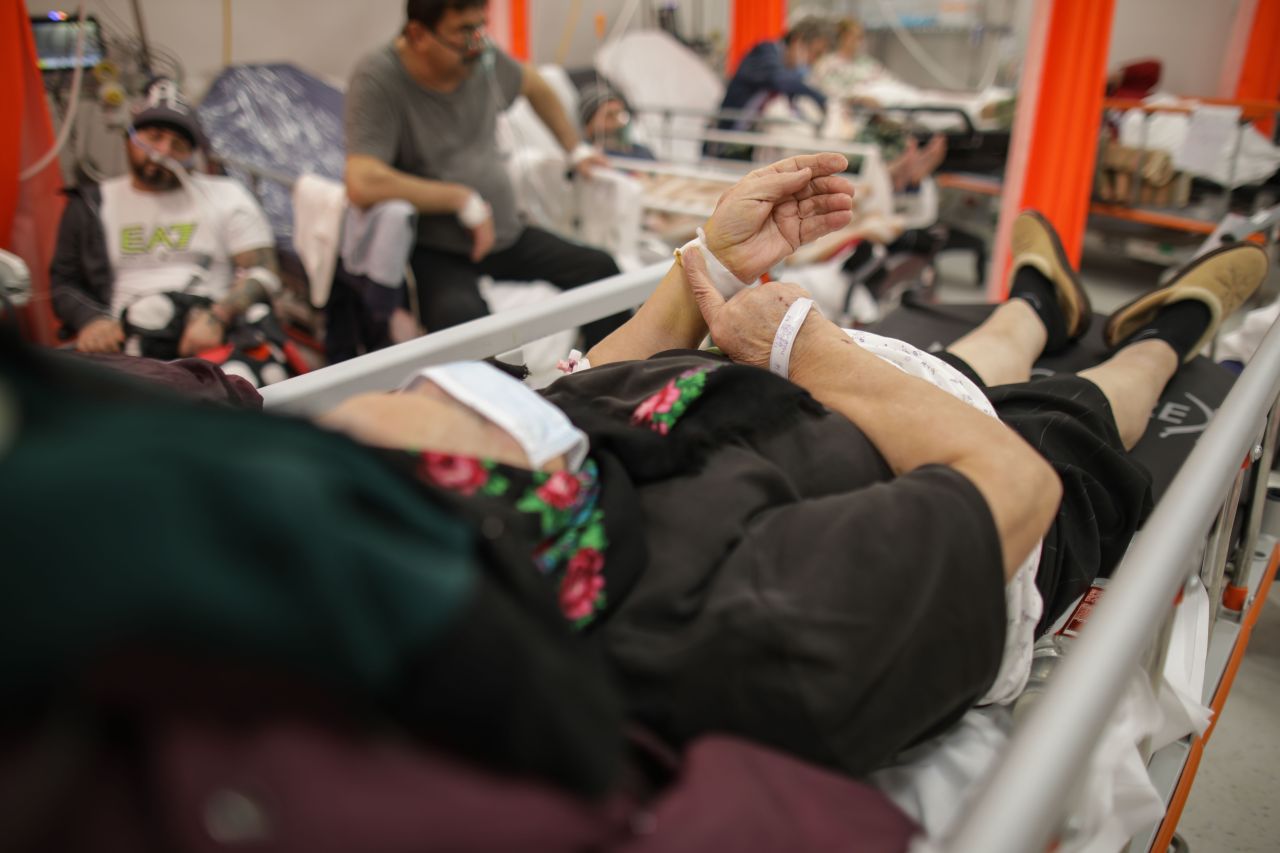 Zeci de bolnavi stau unul lângă altul, conectați la oxigen, iar între paturi nu există nici măcar loc de trecere pentru medici sau asistente.