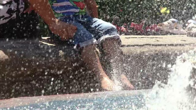 Perdelele cu apă, ca aceasta din spatele meu, ajută la reducerea disconfortului termic. Răcoresc aerul din jur și ajută organismul să se termoreguleze mai ușor. Așa că, dacă aveți una în drum, nu o evitați.