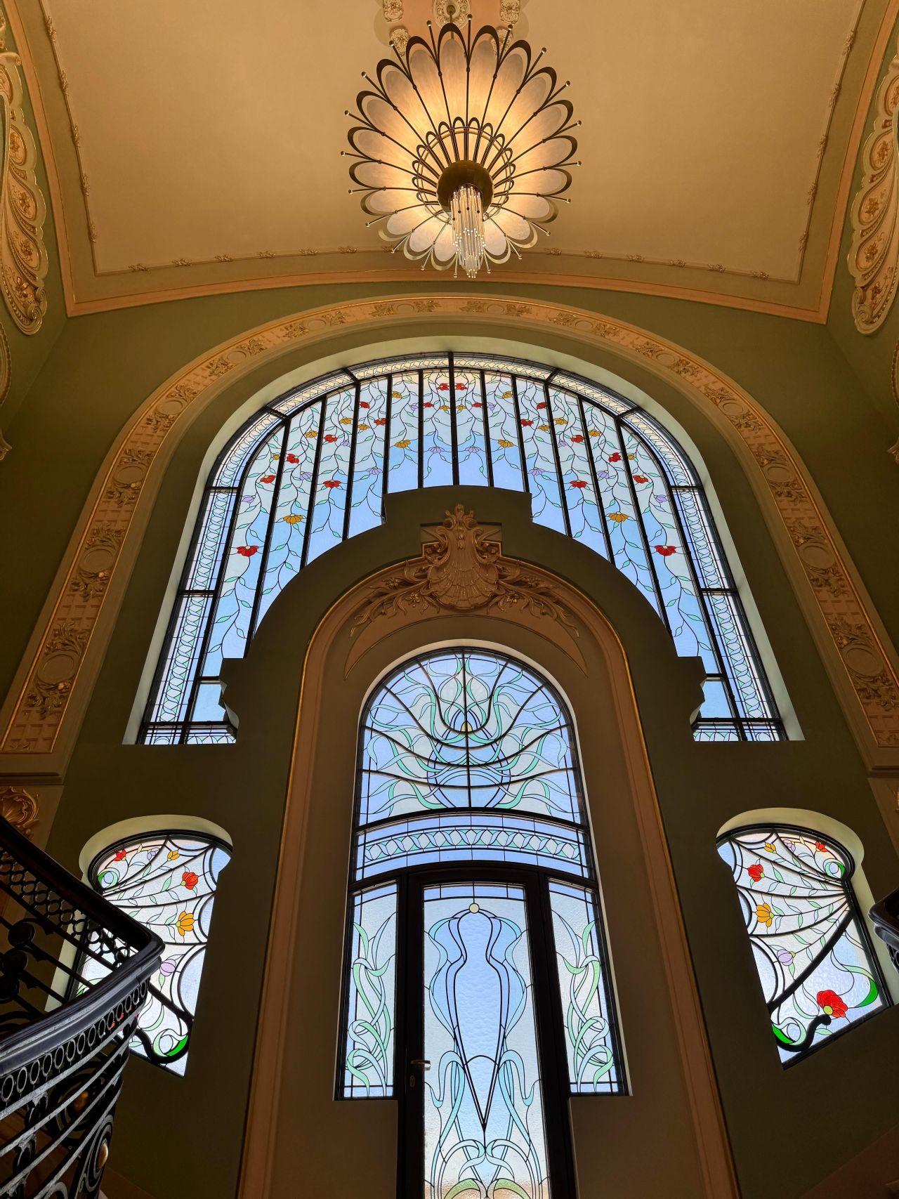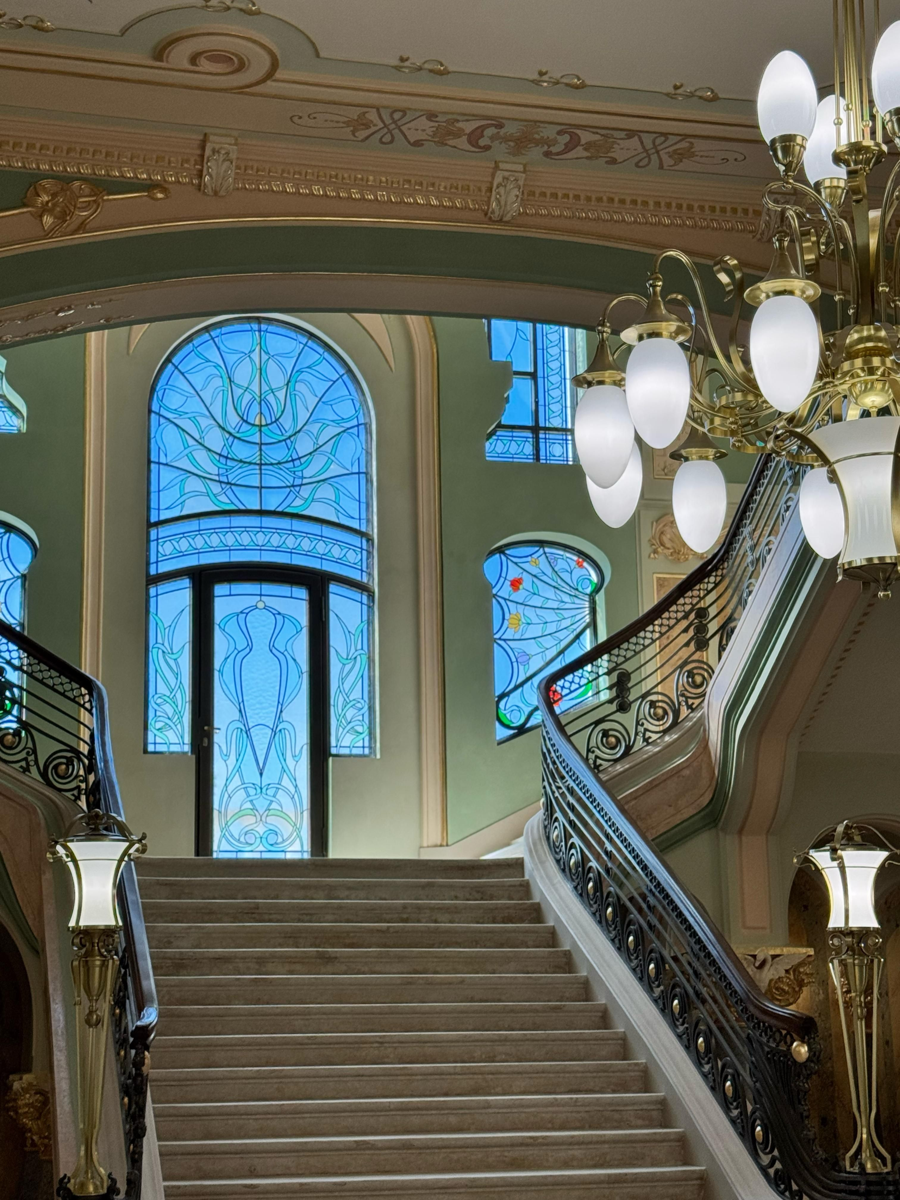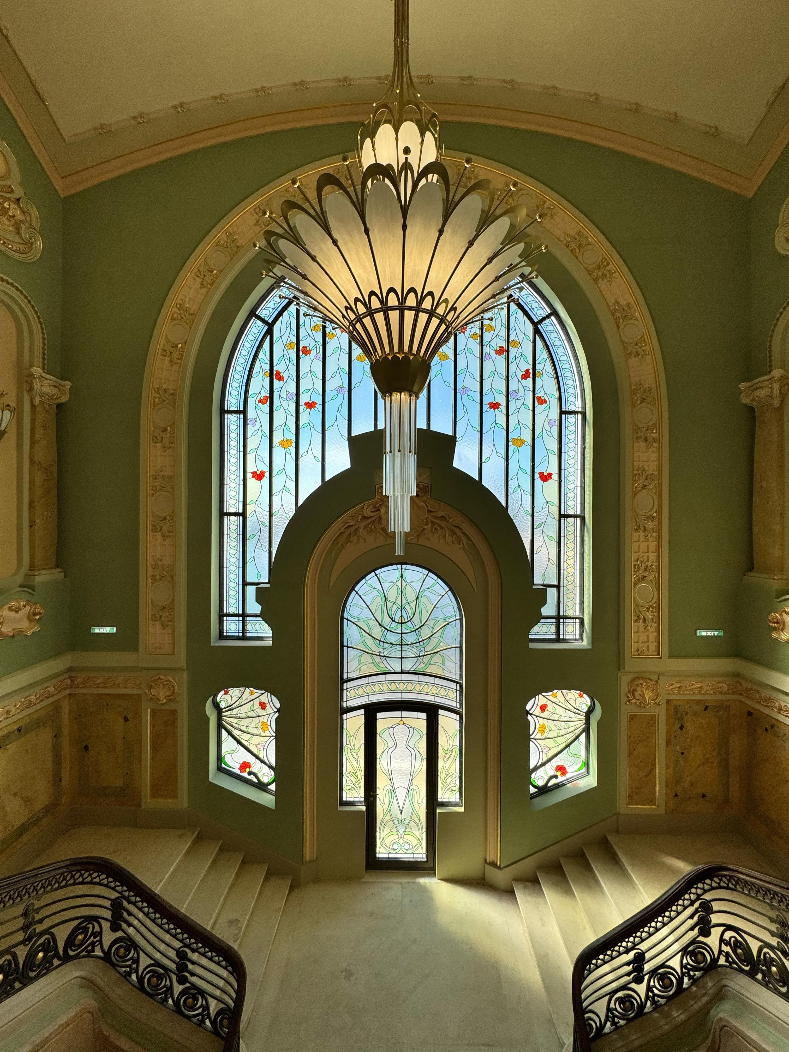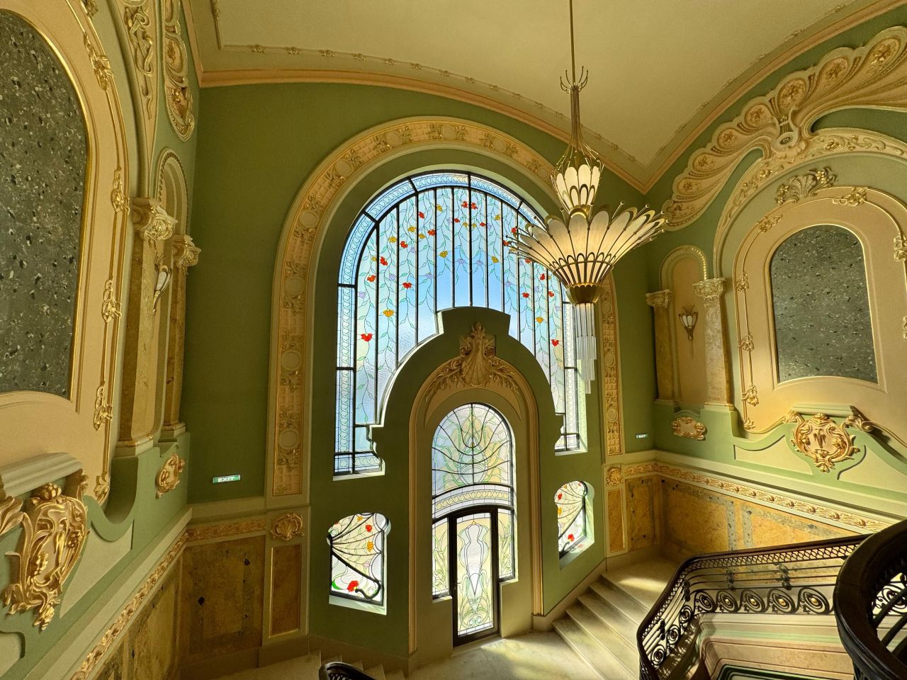Yvette Mîrza: „Odată ce intrați în cazino, veți păși în holul principal de primire. Scara majestuoasă a fost păstrată și a fost restaurată în intregime, aici vorbim de pavement, dar și de balustrade. Corpurile de iluminat sunt noi, însă toate sunt în stil ARTNouveau. Fereastra grandioasă din spatele meu a căzut în anul 1941 la bombardament, acum a fost restaurată în întregime și a primit sticlă de Murano.”