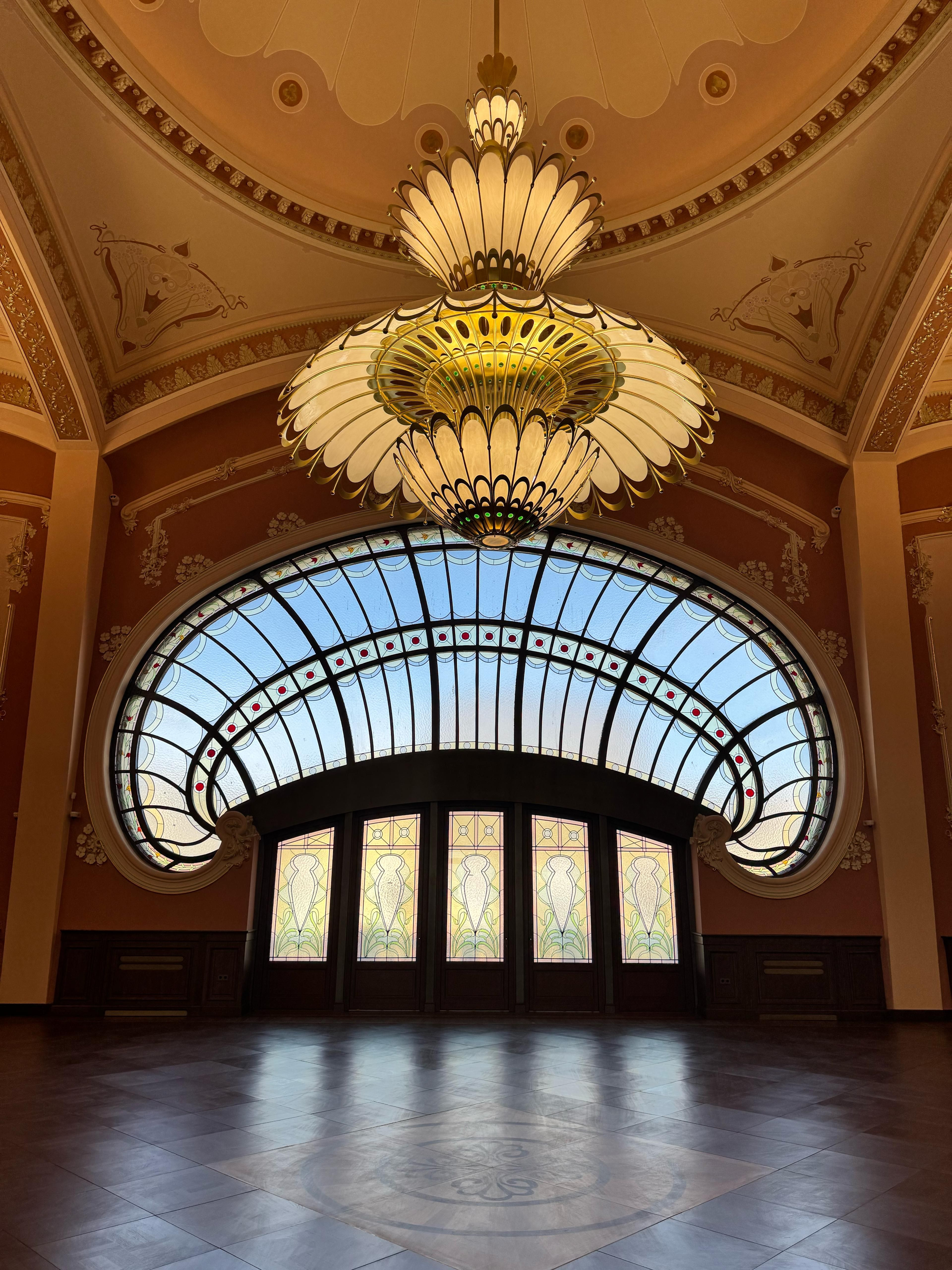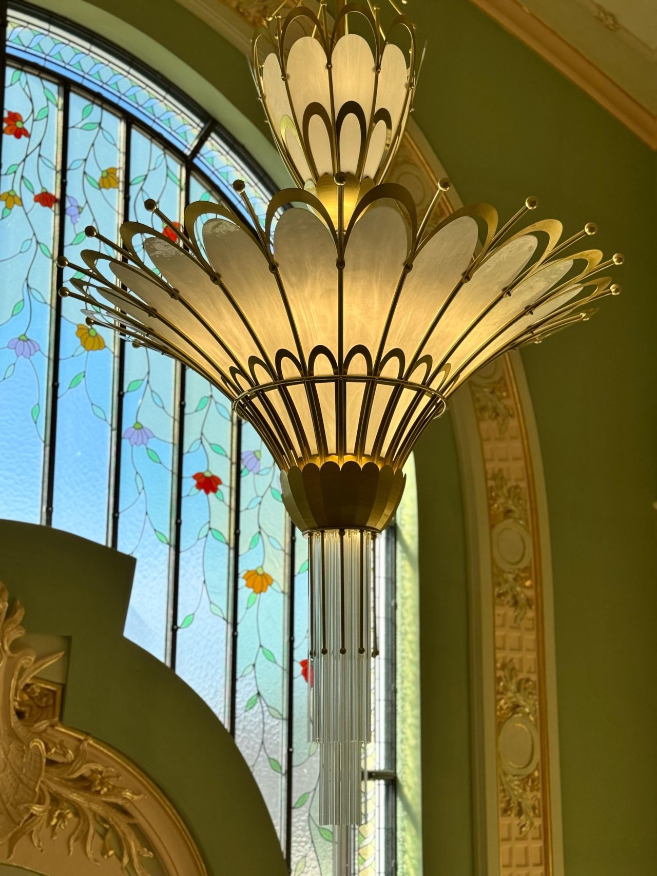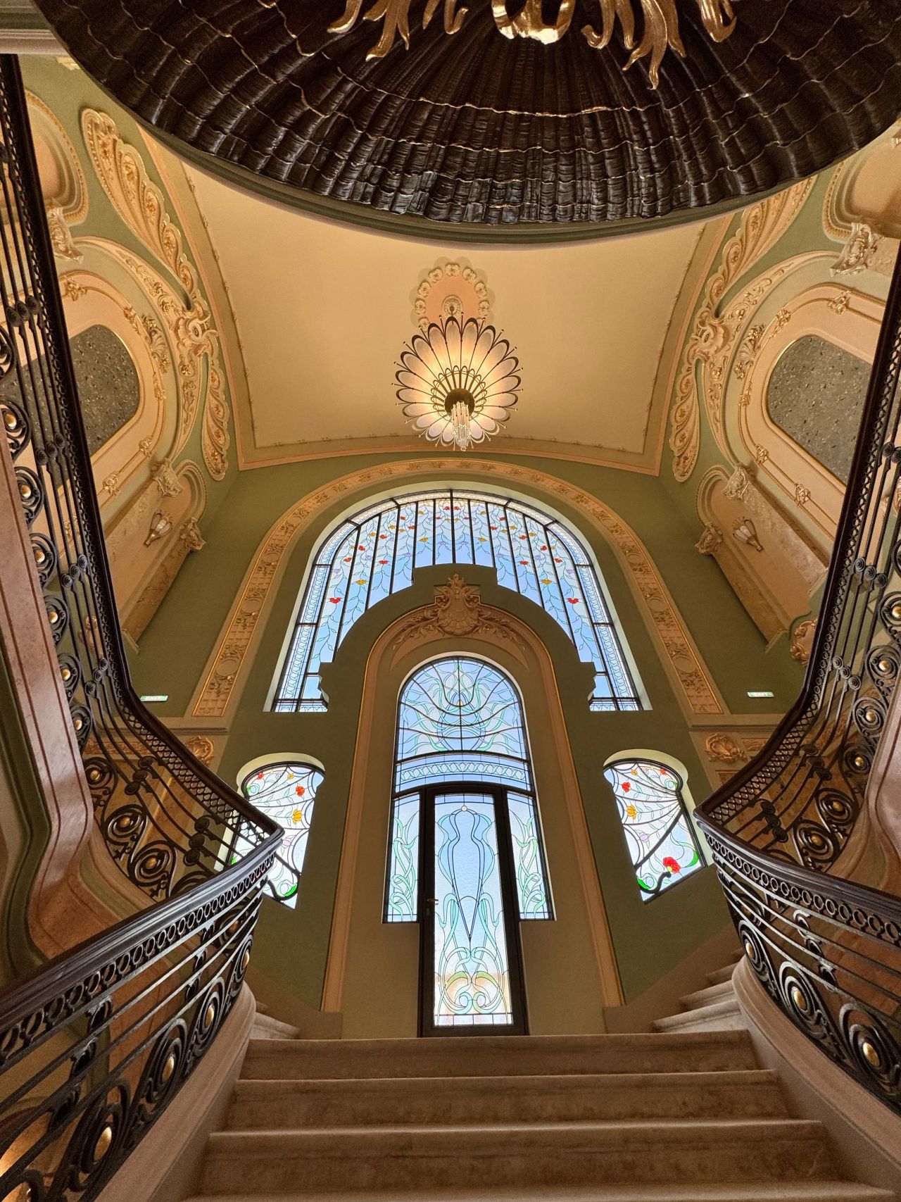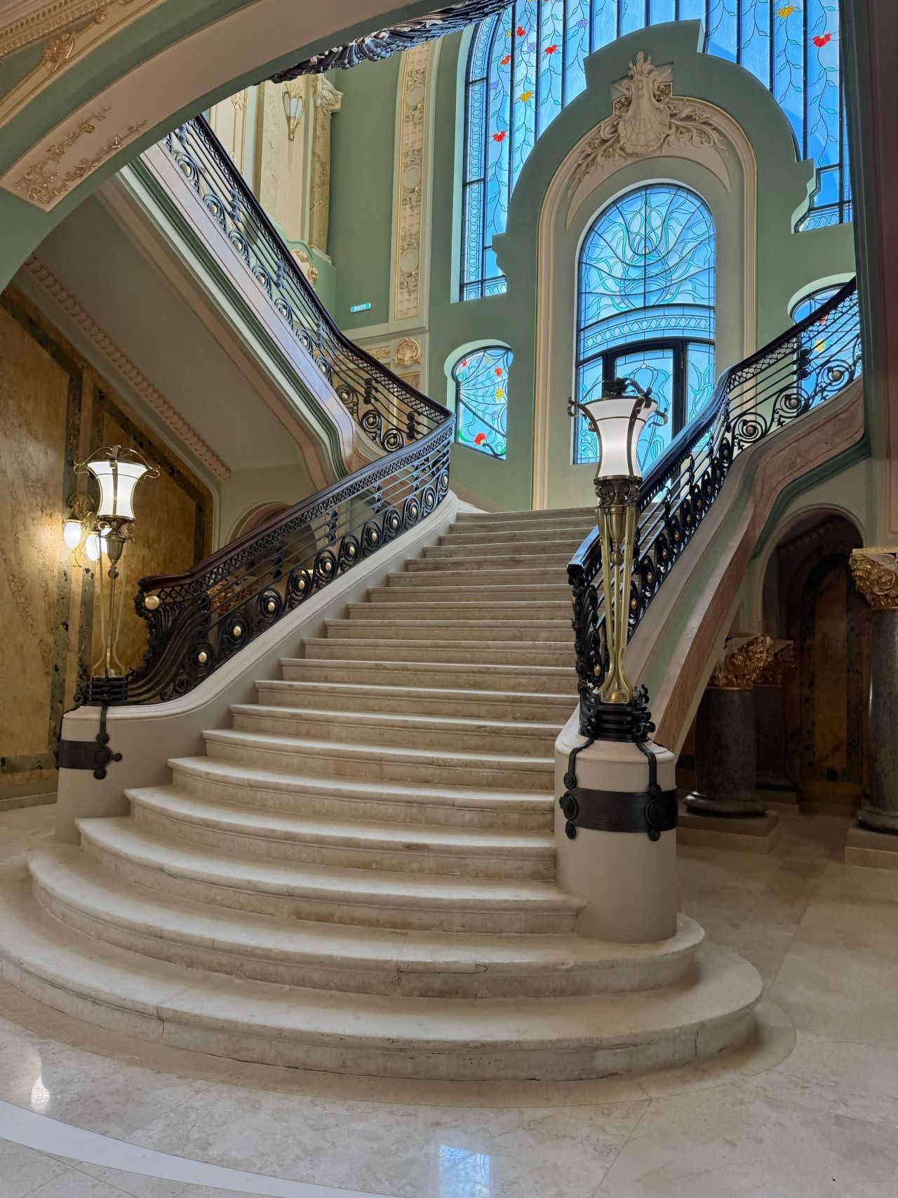 Yvette Mîrza: „Odată ce intrați în cazino, veți păși în holul principal de primire. Scara majestuoasă a fost păstrată și a fost restaurată în intregime, aici vorbim de pavement, dar și de balustrade. Corpurile de iluminat sunt noi, însă toate sunt în stil ARTNouveau. Fereastra grandioasă din spatele meu a căzut în anul 1941 la bombardament, acum a fost restaurată în întregime și a primit sticlă de Murano.”