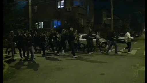 Pe imaginile primite de la un telespectator se vede cum cele doua grupari violente au facut "schimb" de torte si petarde.