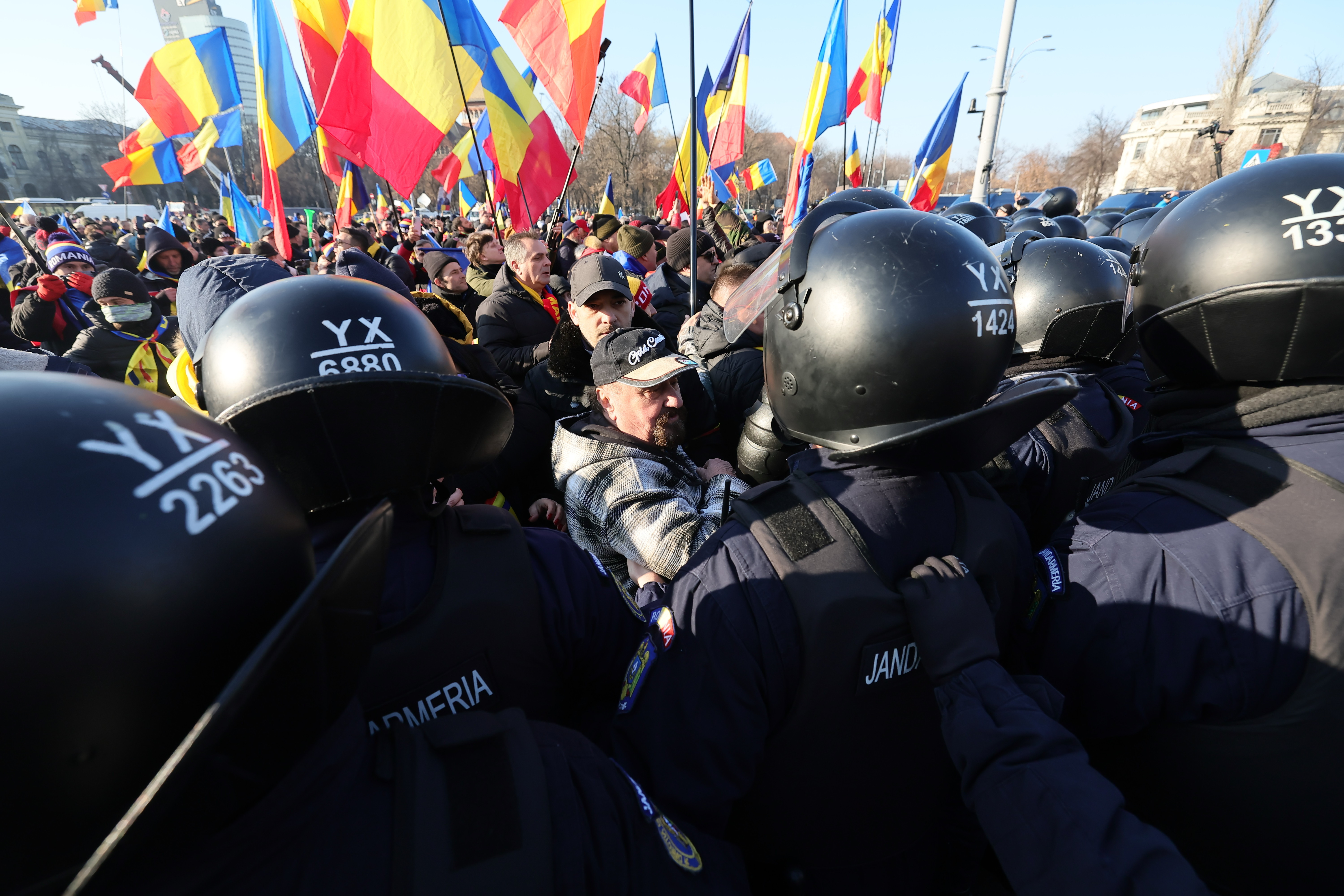 În fața Guvernului, mai mulți protestatari s-au încăierat cu jandarmii, chiar în momentul în care președintele Klaus Iohannis își anunța demisia.