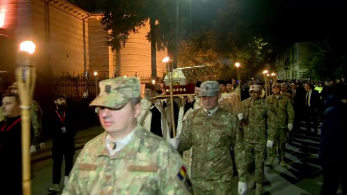 Corespondent Știrile ProTV: Alături au fost puse și moaștele unui mare teolog ortodox, Sfântul Grigorie Palama. În spatele meu puteți vedea un sobor impresionant de 50 de preoți, condus de Mitropolitul Moldovei și Bucovinei și cel al Salonicului. Este singura dată din an când Cuvioasa Parascheva este scoasă din Mitropolie. Chiar în acest moment este înconjurată de militari, cu torțe aprinse, iar în urma noastră sunt mii de pelerini.
