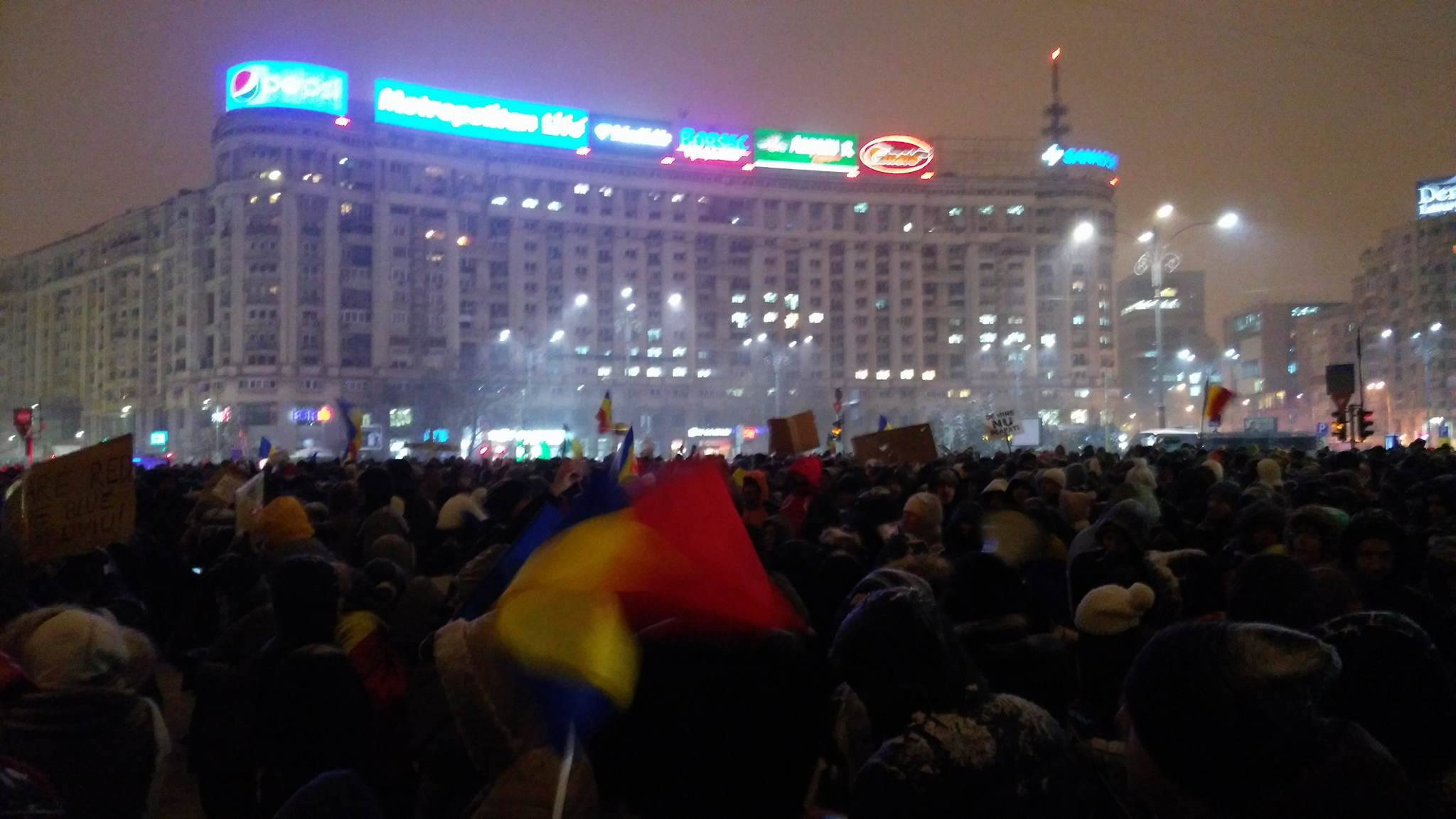 ora 19:00 Pana de curent in centrul Capitalei. Piata Victoriei a ramas in bezna. Este afectata si circulatia metroului. Protestatarii au avut de infruntat frig si zapada, ninge mult in Bucuresti, sunt aproximativ 1500 de persoane in piata din fata Guvernului in acest moment. Circulatia nu e oprita, oamenii continua sa protesteze, indiferent de ce se intampla. Principalul tel este demisia cabinetului, ceea ce nu se intampla, asa ca vor continua sa iasa in Piata Victorie. Nemultumirea persista pentru ca desi au obtinut abrogarea OUG 13, si-au facut sperante ca va pica Guvernul Grindeanu, asa ca de aceea spun ca raman la proteste si vor iesi din case in continuare
