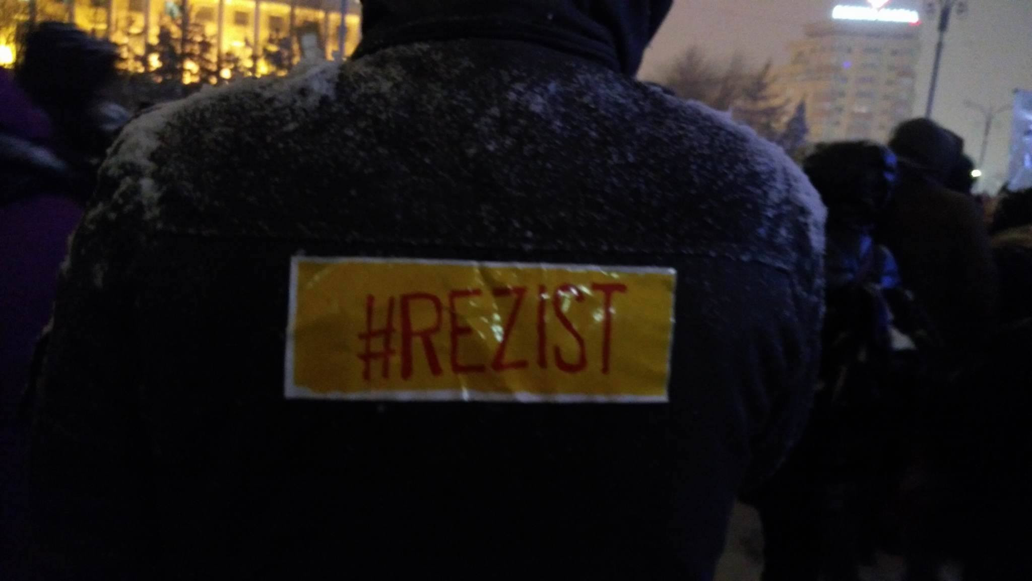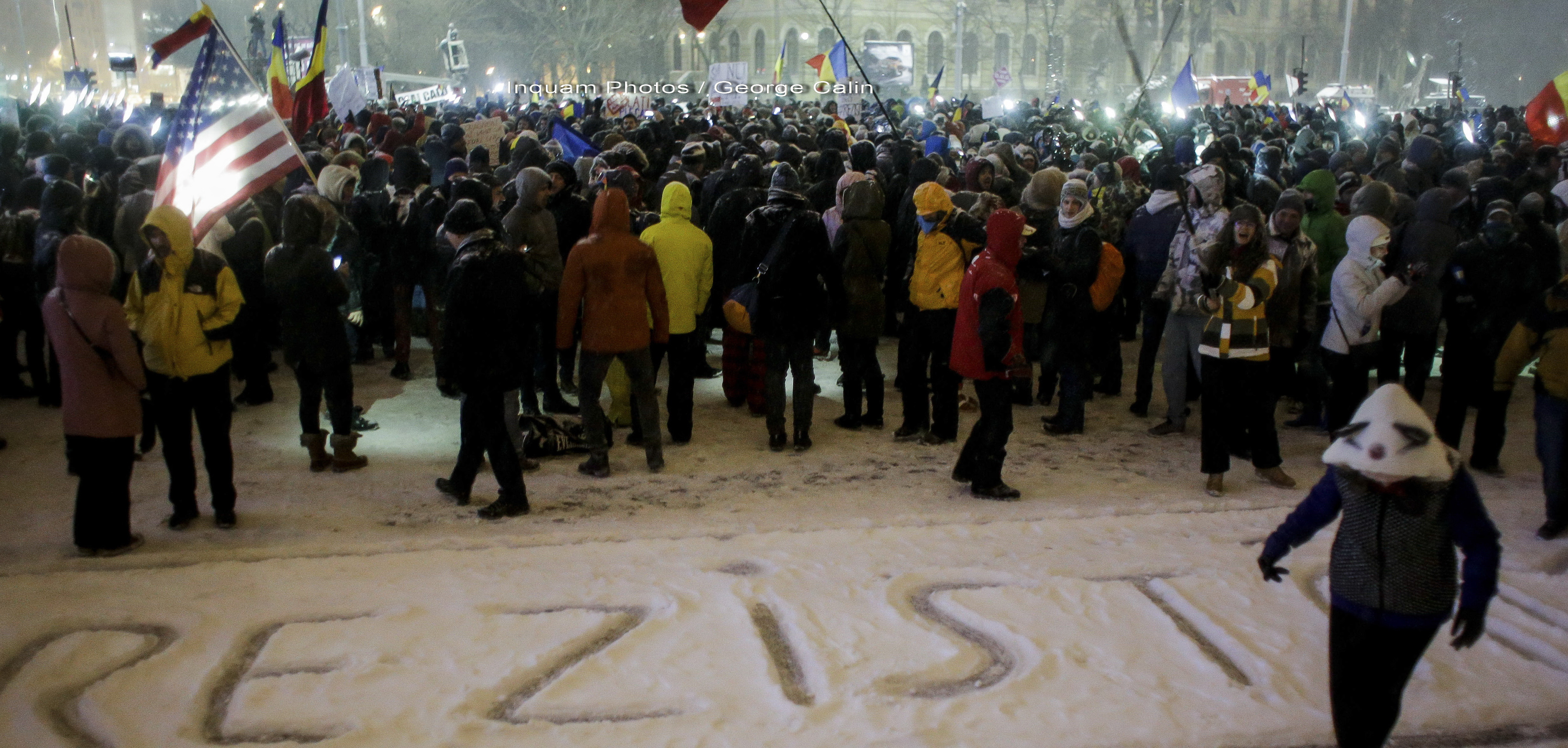 ora 09:00 La ora 9 dimineata, in Piata Victoriei, au aparut primii doi protestatari. Acestia au profitat de zapada depusa si au scris un mesaj: "REZIST".