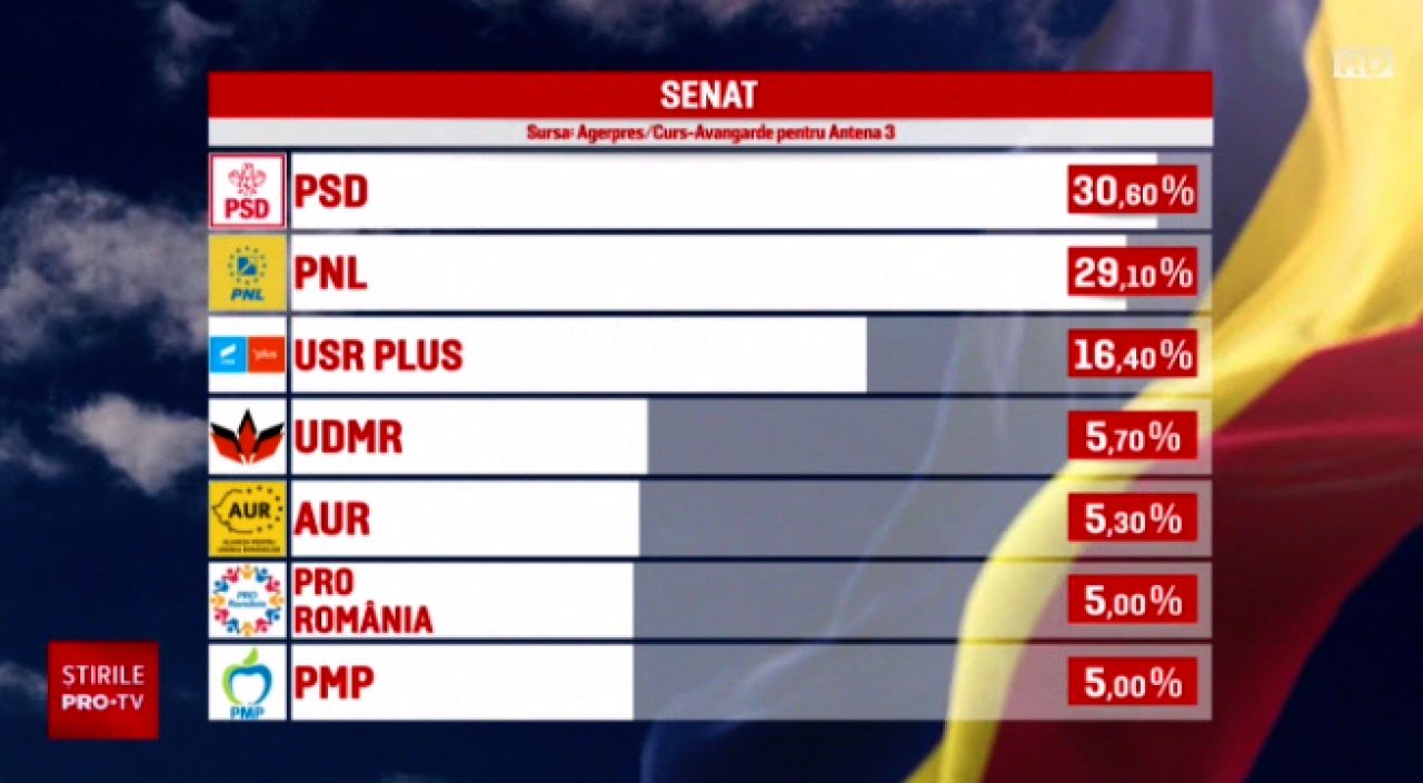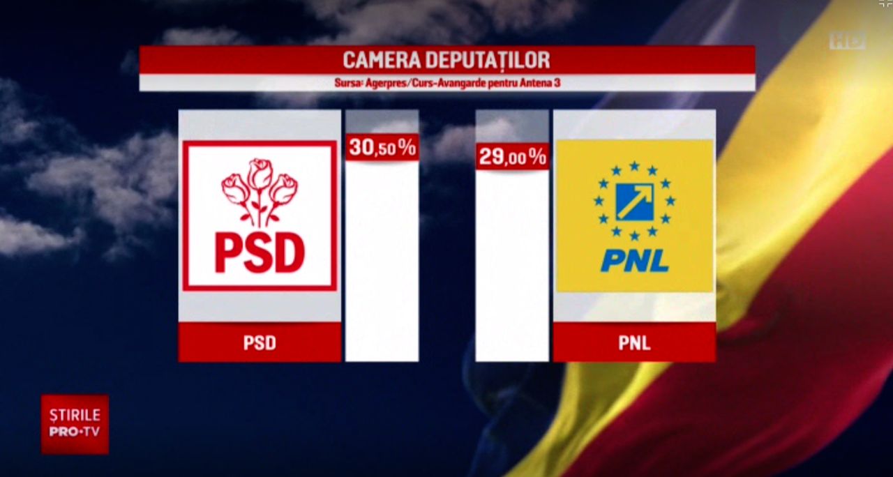 PSD a obţinut, la Senat, 30,6% dintre voturile exprimate la alegerile parlamentare de duminică, la nivel naţional, iar la Camera Deputaţilor - 30,5%, PNL a obţinut, la Senat, 29,1%, iar la Camera Deputaţilor - 29%, potrivit rezultatelor exit-poll-ului realizat de CURS - Avangarde, la comanda Antena 3, pentru ora 19,00, potrivit Agerpres.