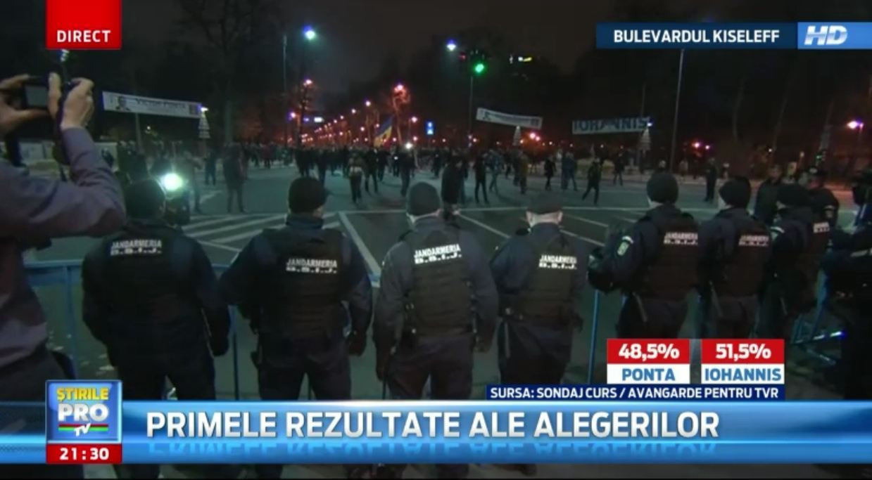 Manifestantii se afla in fata Guvernului, unde sunt incadrati de jandarmi. Dupa ora 21.00, acestia au cautat rezultatele exit poll-urilor, iar la aflarea acestora, unii au inceput sa scandeze "Ponta, nici nu stii cat de mic incepi sa fii". Doua exit poll-uri il prezinta pe Victor Ponta drept castigatorul alegerilor, cu o pondere de 50,72, respectiv 50,9 la suta din voturi, alte doua pe Klaus Iohannis, cu 51,5, respectiv 50,9 la suta din voturi, iar un al patrulea exit poll atribuie cate 50 la suta din voturi fiecarui candidat.