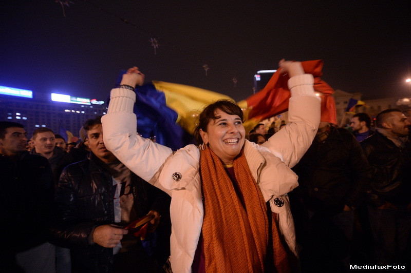 Dupa anuntarea castigatorului alegerilor, conform numaratorilor paralele ale partidelor opozante, s-a manifestat si bucuria pentru victoria lui Klaus Iohannis. Astfel, cand liderul ACL a ajuns in Piata Universitatii, multimea a inceput sa scandeze "Klaus, Klaus, Klaus, ne-ai scapat de Mickey Mouse", "Victorie", "Iohannis", "Jos Ponta", Romania, Romania, ole, ole, ole".