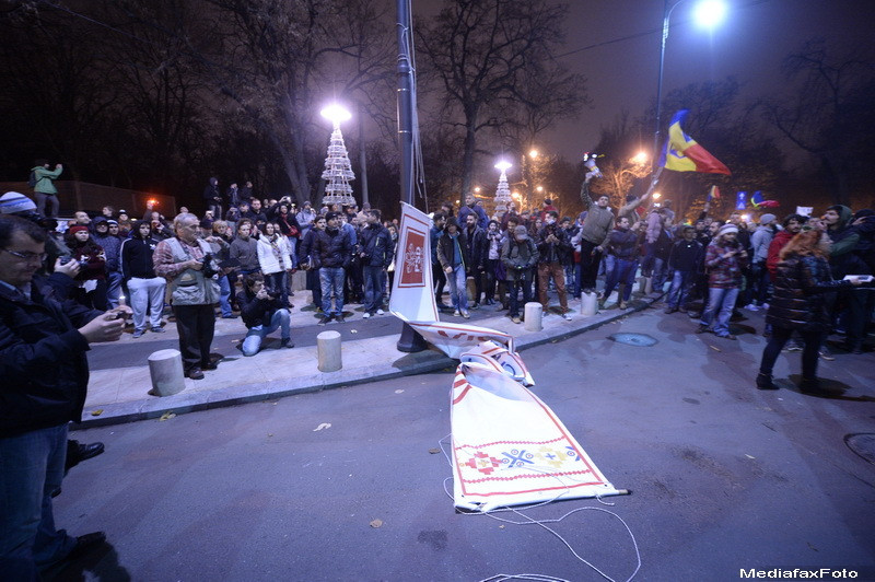 Intorsi la Universitate, dupa un protest in fata Guvernului si o incercare de a face acelasi lucru si la sediul PSD, oprita insa de fortele de ordine, miile de oameni au scandat in continuare mesaje impotriva lui Victor Ponta si a partidului pe care il conduce si chiar au purtat o cruce cu textul "PSD. Victor Ponta. d. 2014".