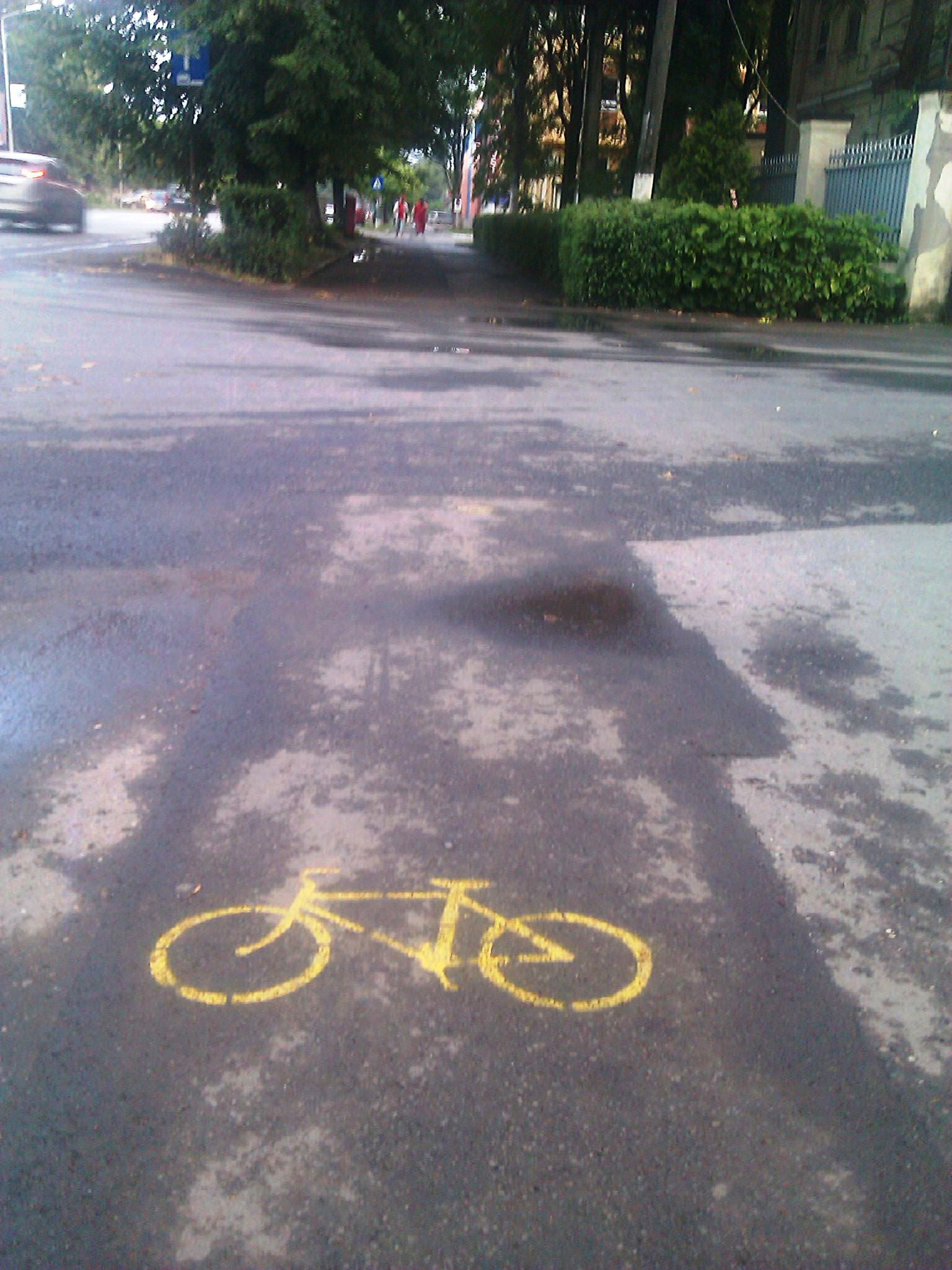 Cu toate acestea, de cateva zile, a aparut marcata pe trotuar, pe Calea Victoriei, o pista pentru biciclisti. Un simbol specific este vopsit cu galben pe toata lungimea trotuarului, intre Piata UTA si zona Intim.