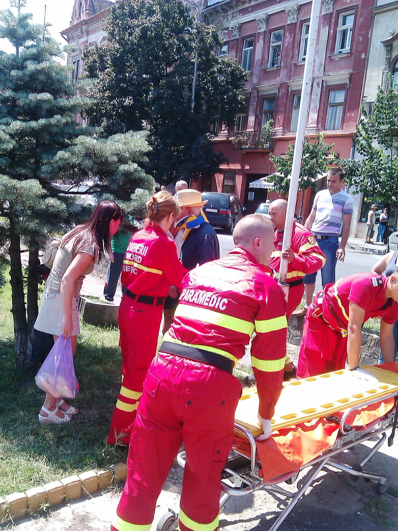 Trecatorii au sunat imediat la 112, iar la fata locului a fost mobilizat un echipaj de medici de la SMURD, constatandu-se ca victima are rani la cap si la gat.