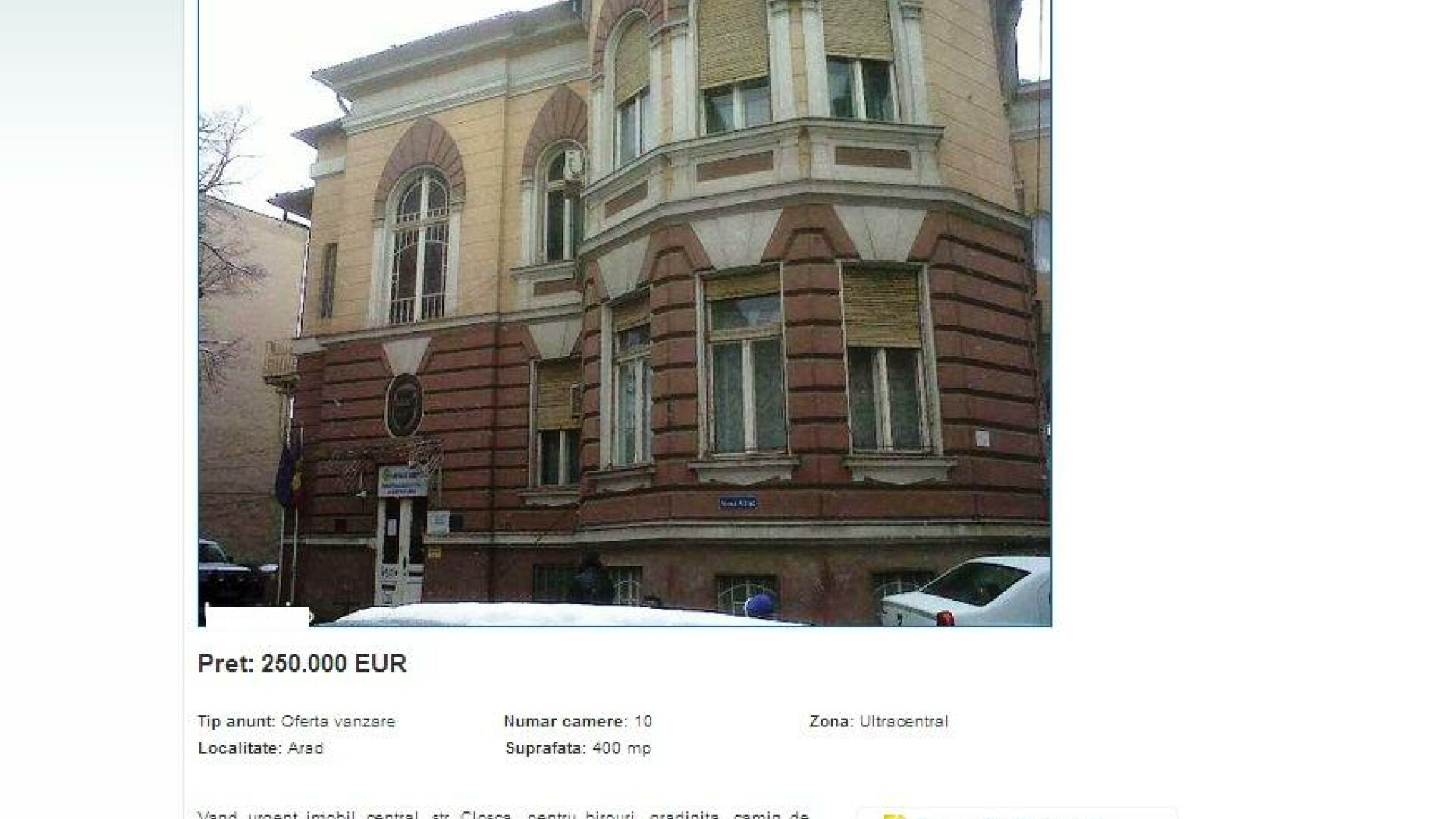 In anunturile postate la finele saptamanii trecute – aparent semnate de Nicolae Bacanu, fost presedinte al CCIA Arad, al carui numar de telefon e publicat - palatul fostei Directii a Muncii este vandut cu numai 350.000 de euro. Imobilul este numit “vila” si, conform anuntului, s-ar preta pentru locuinte, birouri, gradinita sau camin de batrani.