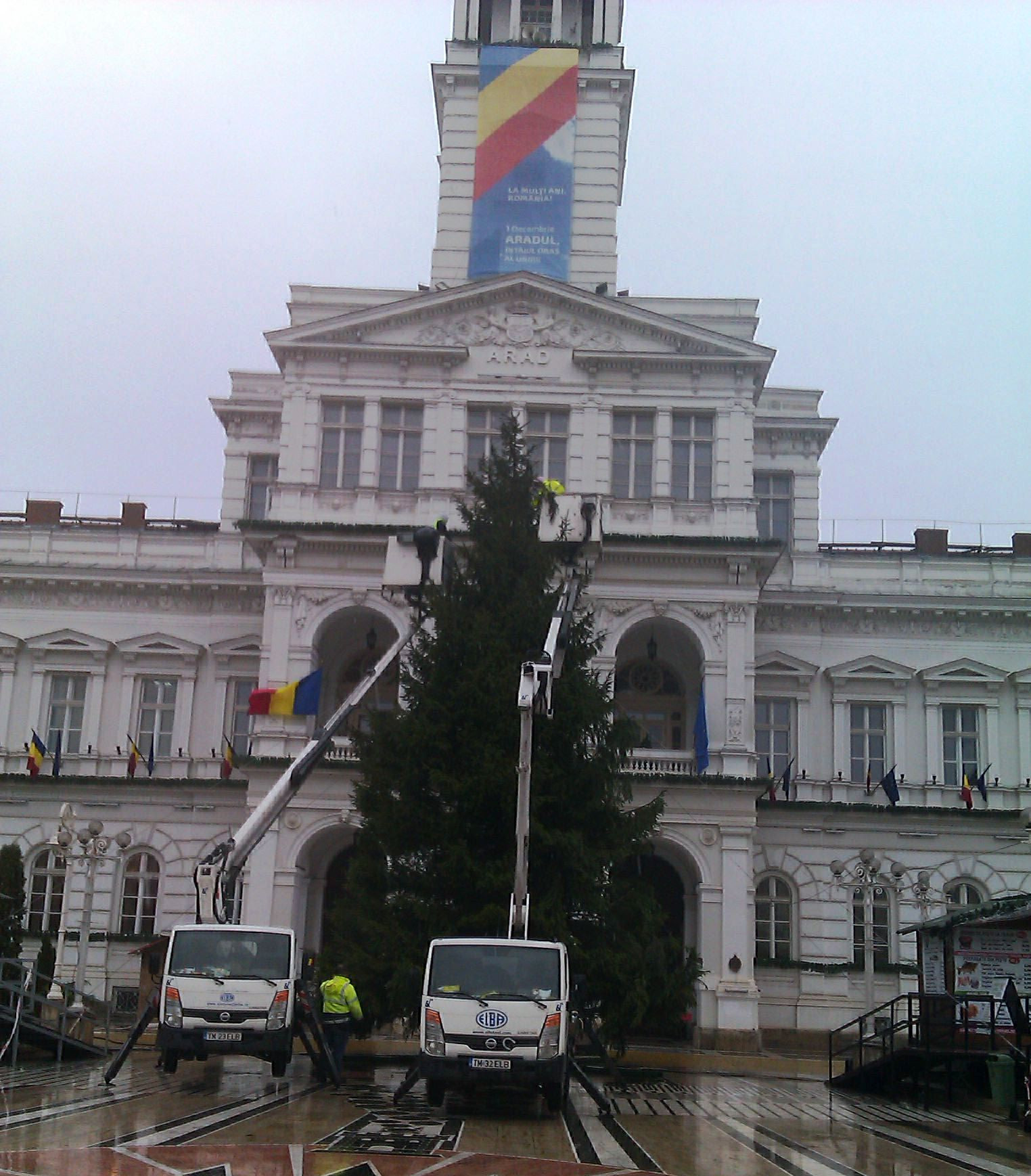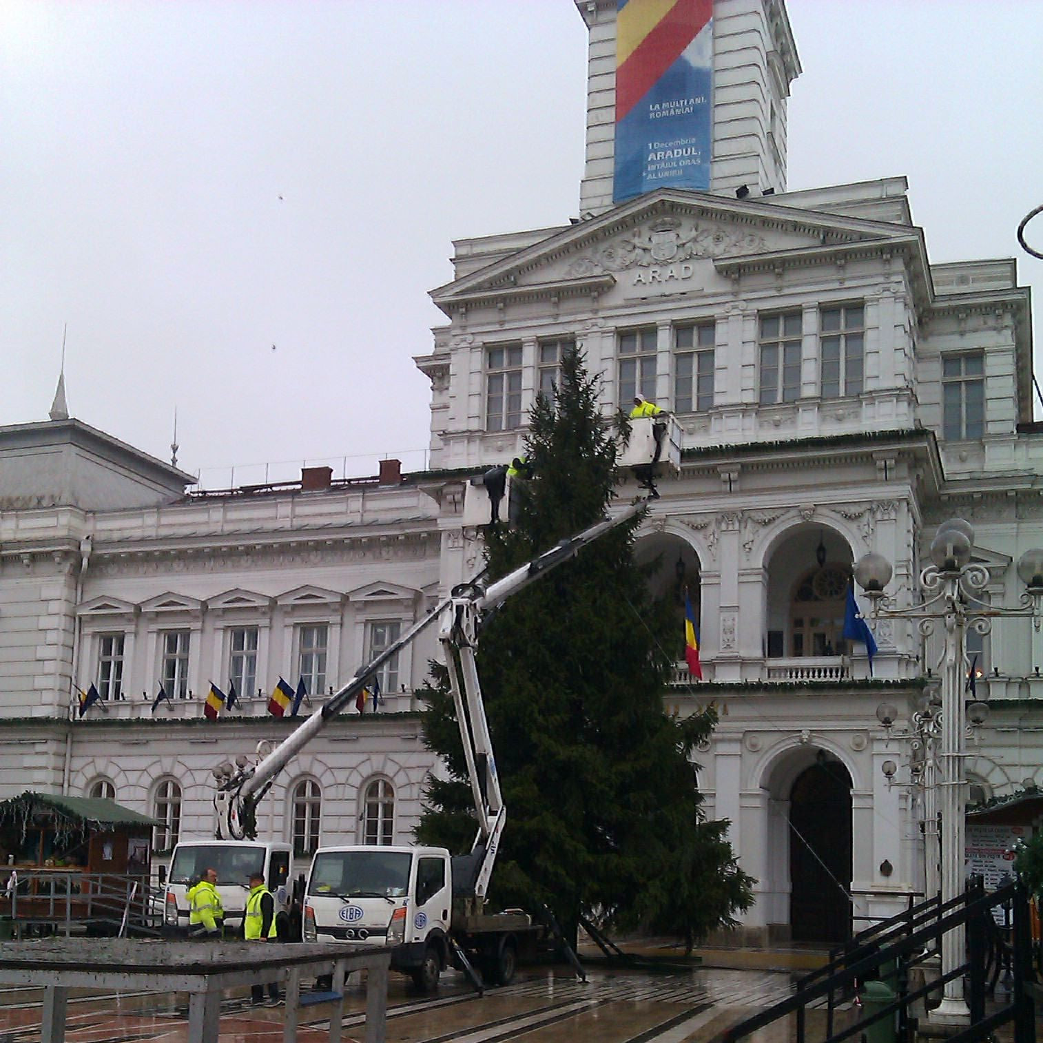 Odata cu primii fulgi de nea a fost instalat si bradul de Craciun in fata Primariei Arad