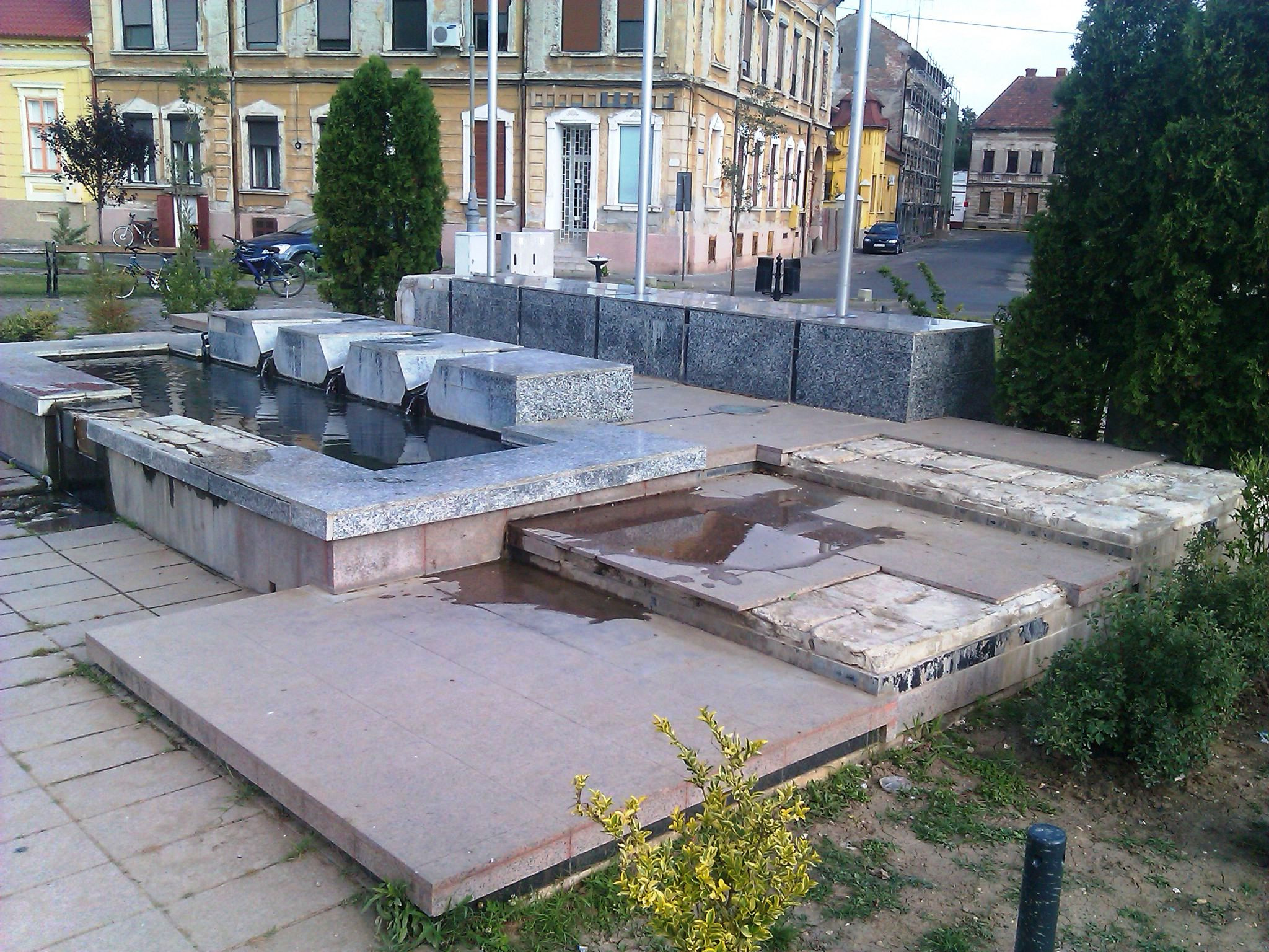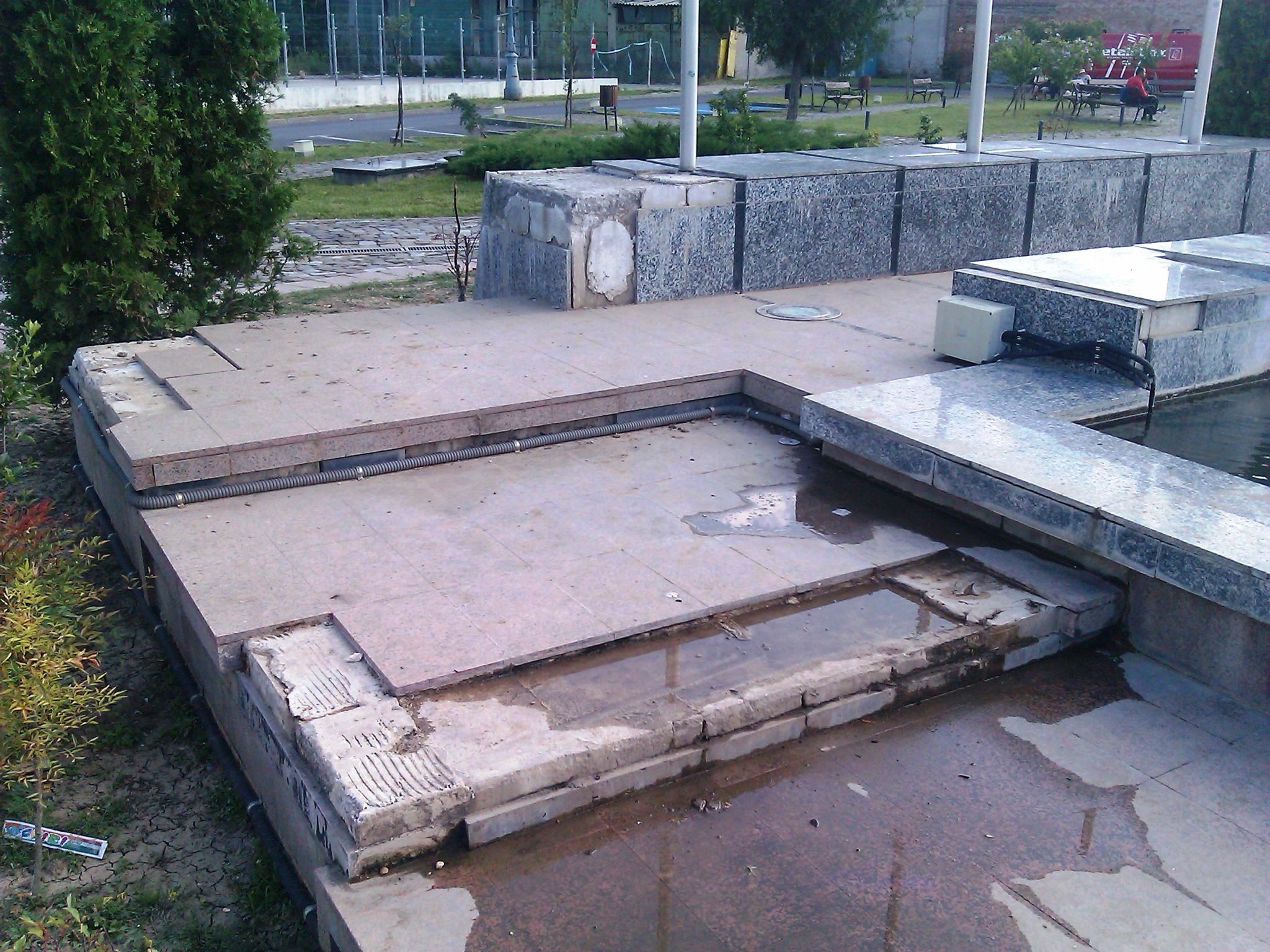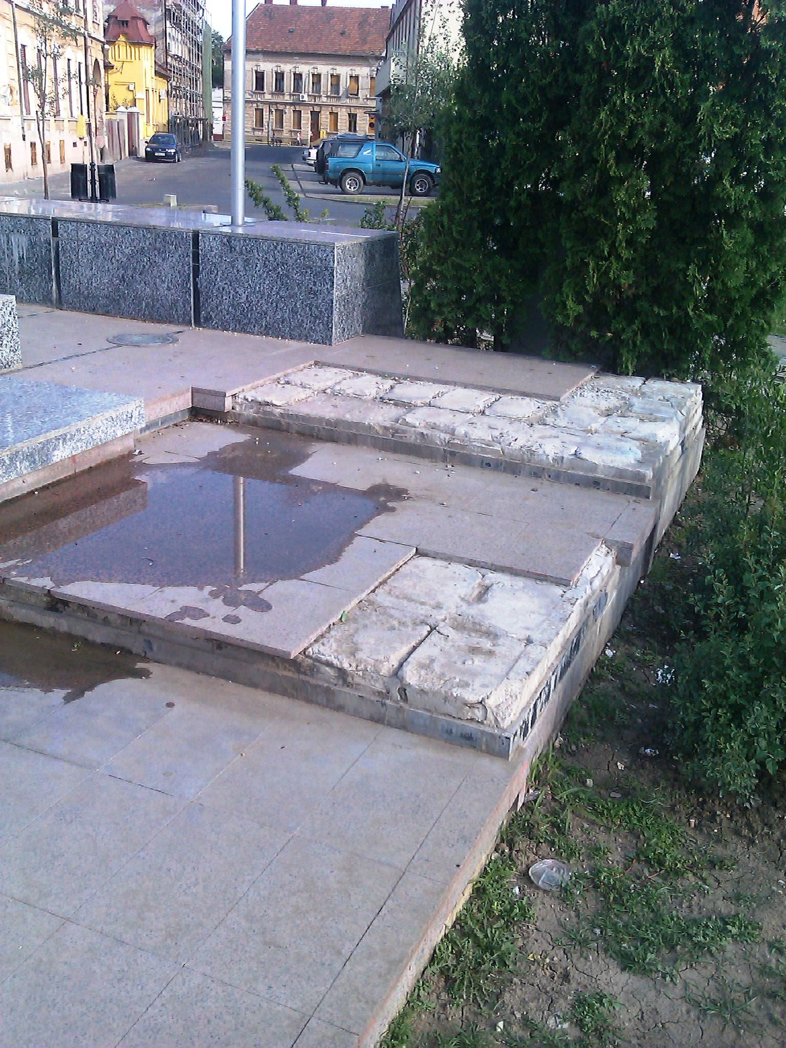 Nici portdrapelul nu arata mai bine, baza acestuia – din care tasnesc trei jeturi de apa ce se scurg prin rigole in bazin – fiind marcata de lipsa multor placi de gresie.
