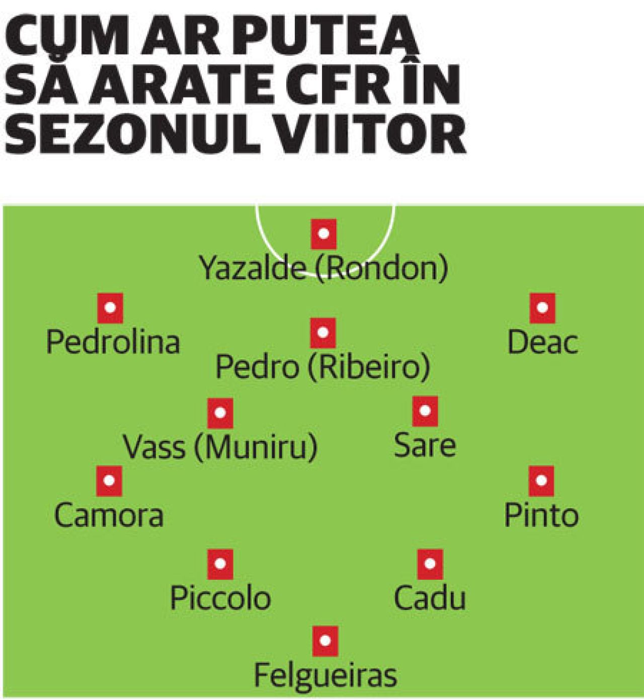 CFR vrea sa aconteze sase jucatori straini in aceasta vara, insa sunt sanse mici sa fie transferat si vreun roman. Clubul din Gruia revine astfel la reteta de succes care i-a adus titlurile din 2008, 2010 si 2012, cand a mizat pe jucatori straini, iar dintre romani doar Muresan, Trica, Deac si Stancioiu au prins perioade mai lungi ca titulari. Drept urmare, Muresan, Minca, Panin, Maftei, Hora si Ganea au sanse mici sa mai continue din vara in Gruia. Acestora li se vor adauga Diogo, Kivuvu, Celestino, Bjelanovic, Godemeche, Obiora, Weldon si Kapetanos.