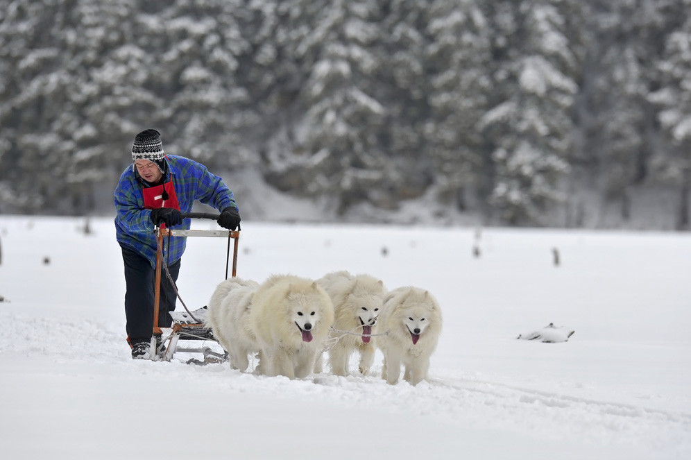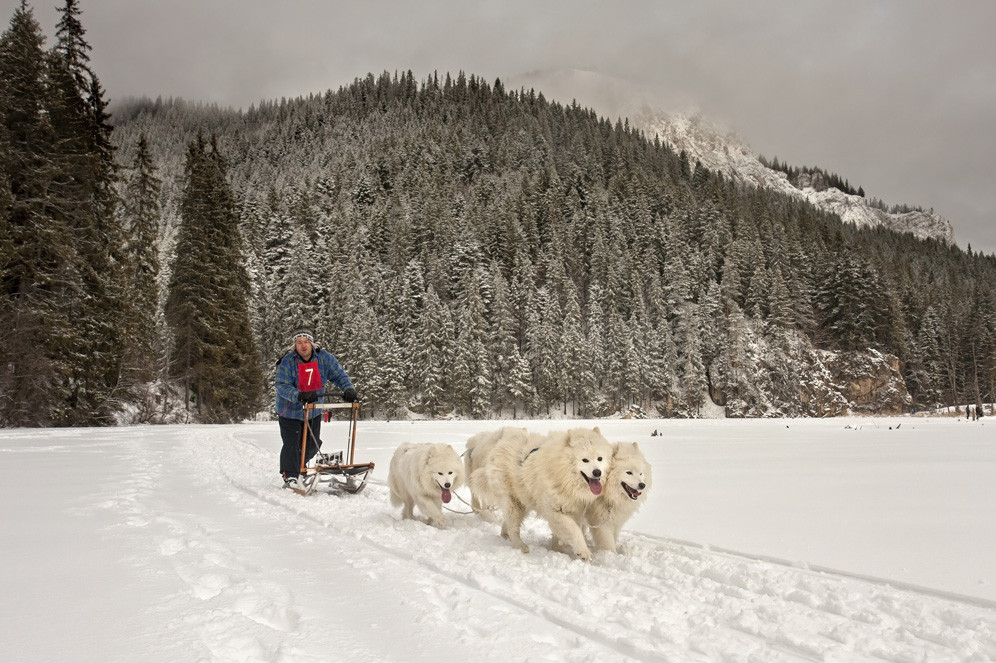 Mai mult din pasiune, 15 persoane au participat zilele trecute, la Lacul Rosu, la un concurs inedit: o cursa de atelaje trase de caini.