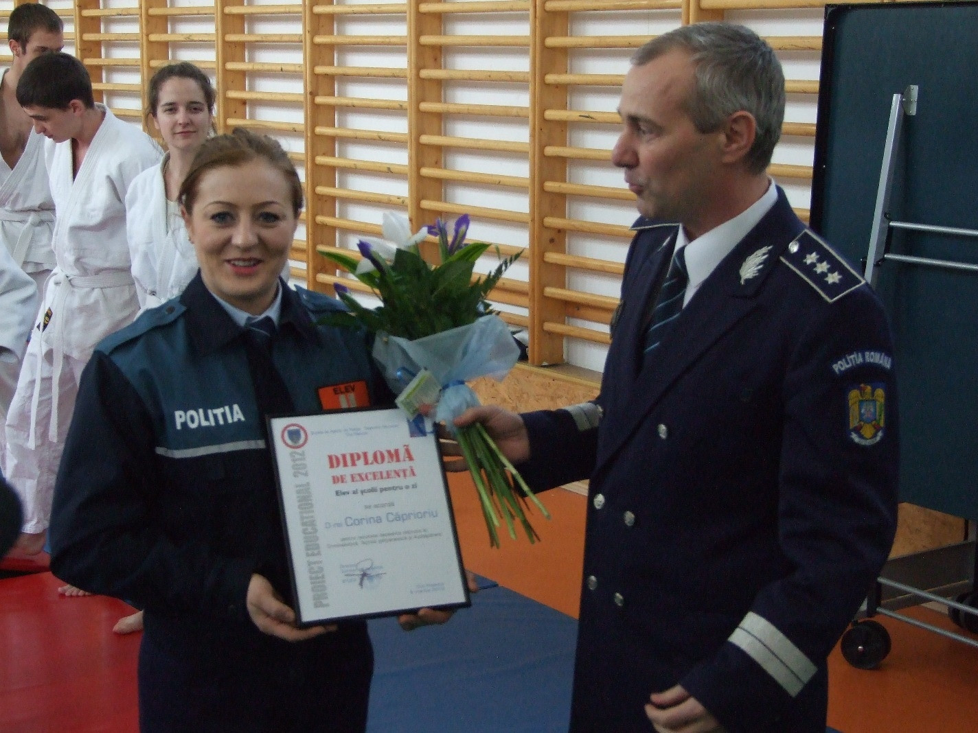 De pe tatami Corina a trecut azi la arestari, catuse si amprente. Imbracata in uniforma de politist judokana anului 2011 si-a luat rolul in serios si a participat la o simulare de interventie in cazul conflictelor din localurile publice facand parte din echipajul de politie care a raspuns la 112. La final a participat la o demonstratie de autoaparare a membrilor cercului de judo al Scolii.
